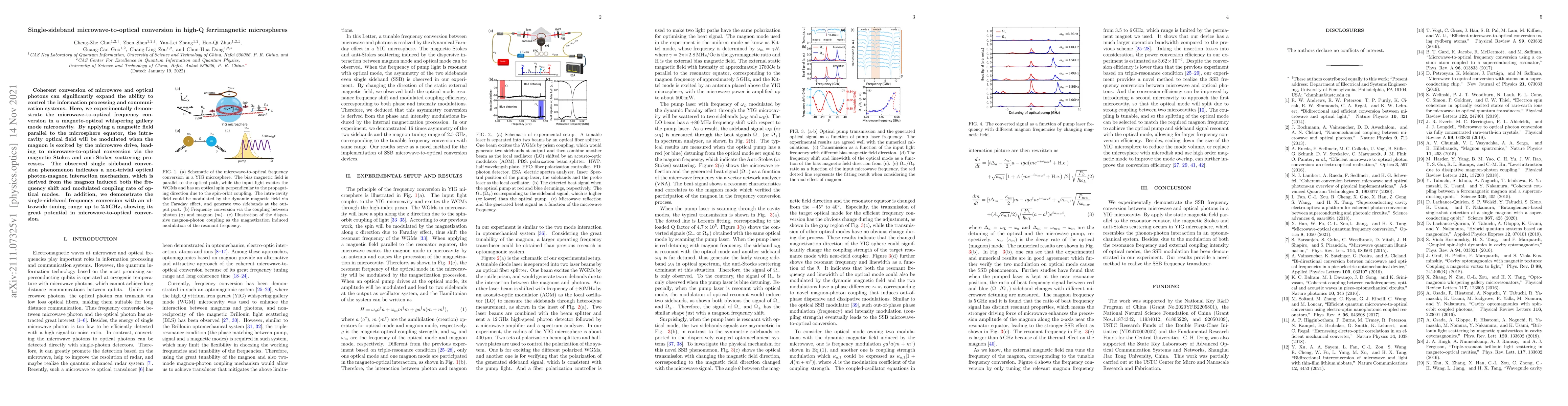 This paper demonstrates microwave-to-optical conversion in high-Q ferrimagnetic microspheres using magneto-optical whispering gallery mode microcavities. The conversion is achieved via magnetic Stokes and anti-Stokes scattering processes, showing a single sideband with an ultrawide tuning range up to 2.5GHz, indicating significant potential for information processing and communication systems.