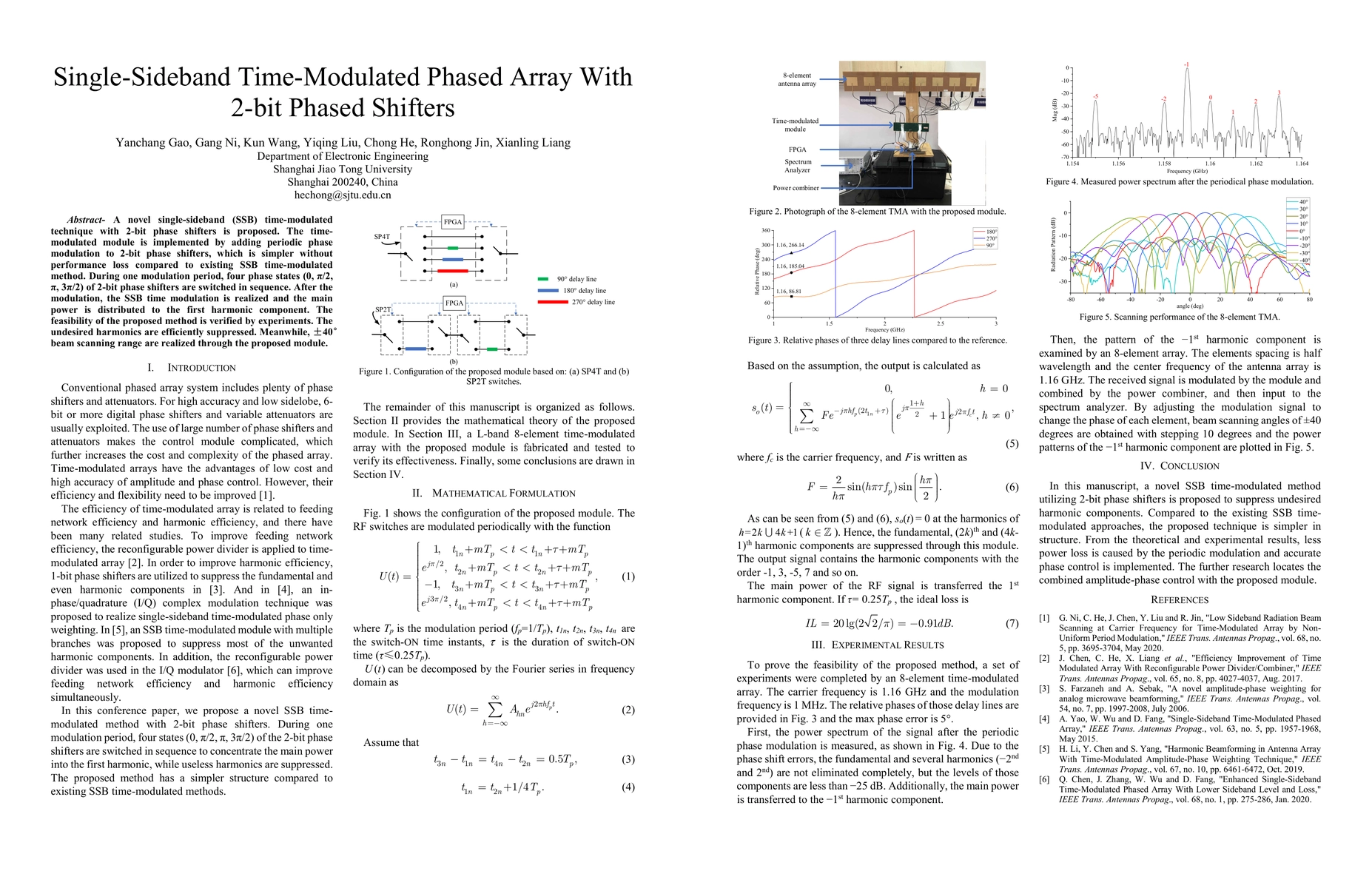 This paper proposes a novel single-sideband (SSB) time-modulated phased array technique using 2-bit phase shifters, which simplifies modulation without performance loss. The method efficiently suppresses undesired harmonics and achieves a 80° beam scanning range.