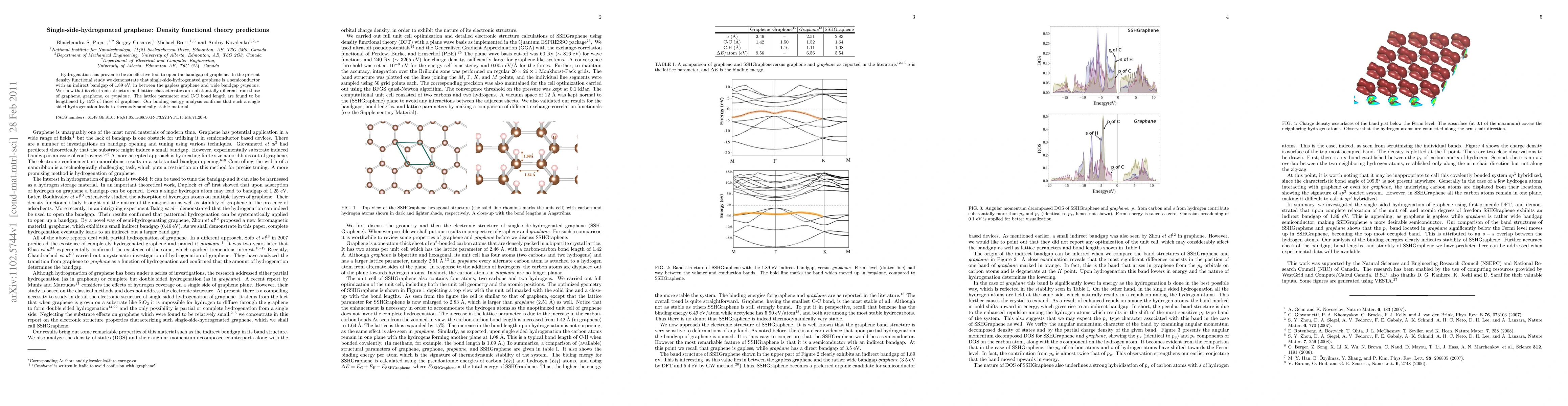This study reveals that single-sided hydrogenated graphene is a semiconductor with an indirect bandgap of 1.89 eV, significantly different from the gapless graphene and wide bandgap graphane, with a 15% increase in lattice and C-C bond lengths, providing thermodynamically stable material.