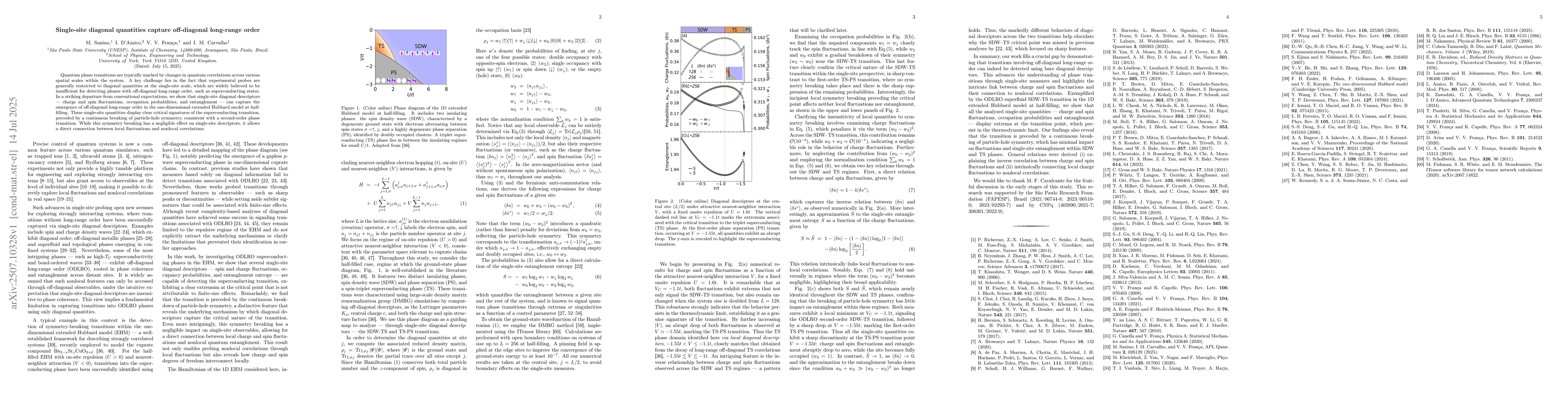 Quantum phase transitions are typically marked by changes in quantum correlations across various spatial scales within the system. A key challenge lies in the fact that experimental probes are generally restricted to diagonal quantities at the single-site scale, which are widely believed to be insufficient for detecting phases with off-diagonal long-range order, such as superconducting states. In a striking departure from conventional expectations, we show that single-site diagonal descriptors -- charge and spin fluctuations, occupation probabilities, and entanglement -- can capture the emergence of off-diagonal long-range order in the one-dimensional extended Hubbard model at half-filling. These single-site quantities display clear critical signatures of the superconducting transition, preceded by a continuous breaking of particle-hole symmetry, consistent with a second-order phase transition. While this symmetry breaking has a negligible effect on single-site descriptors, it allows a direct connection between local fluctuations and nonlocal correlations.
