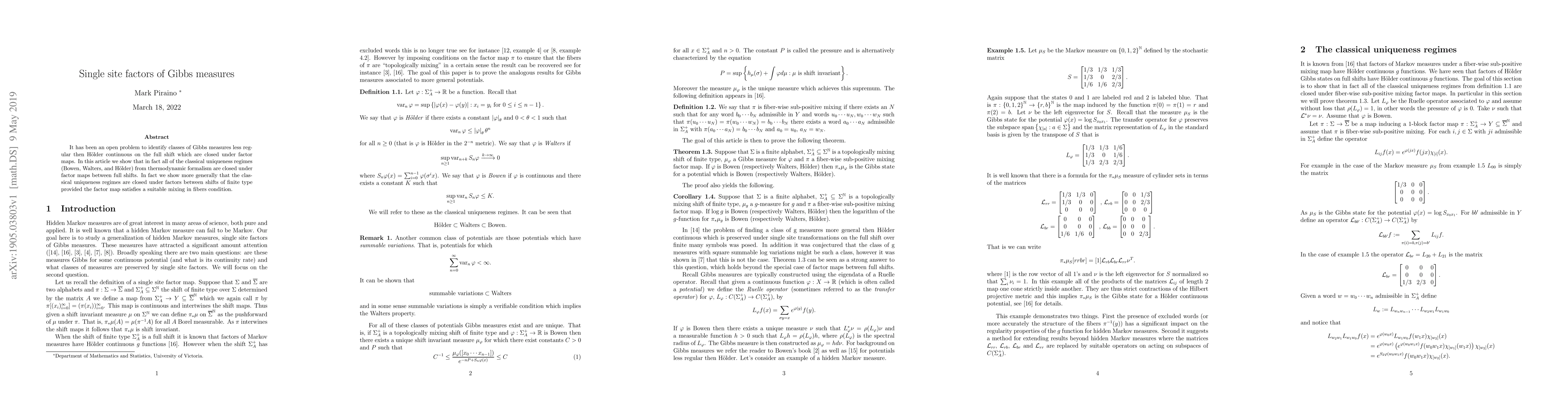 It has been an open problem to identify classes of Gibbs measures less regular then H\"older continuous on the full shift which are closed under factor maps. In this article we show that in fact all of the classical uniqueness regimes (Bowen, Walters, and H\"older) from thermodynamic formalism are closed under factor maps between full shifts. In fact we show more generally that the classical uniqueness regimes are closed under factors between shifts of finite type provided the factor map satisfies a suitable mixing in fibers condition.