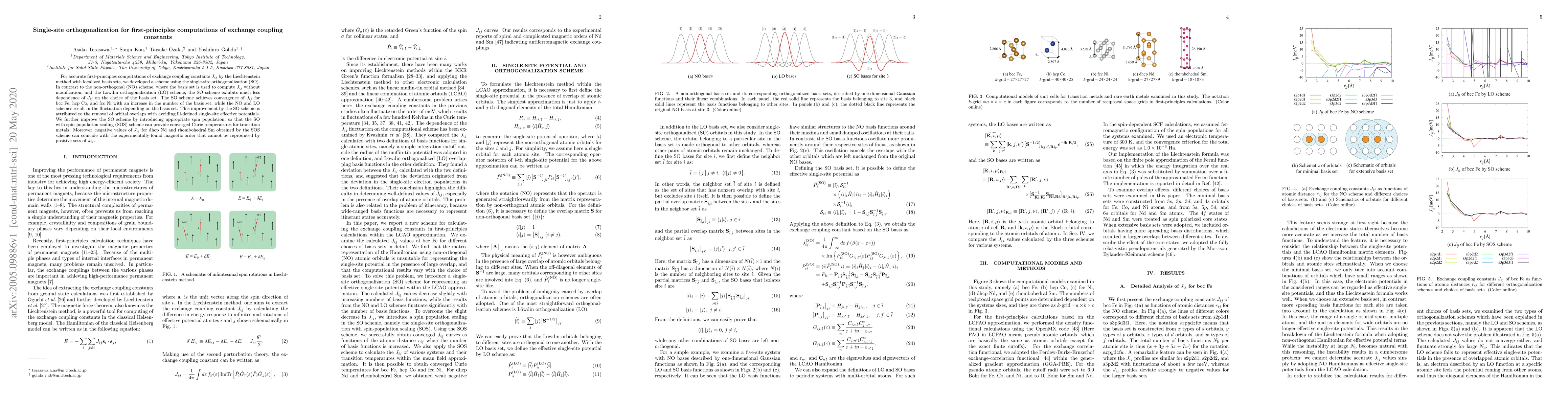 For accurate first-principles computations of exchange coupling constants $J_{ij}$ by the Liechtenstein method with localized basis sets, we developed a scheme using the single-site orthogonalization (SO). In contrast to the non-orthogonal (NO) scheme, where the basis set is used to compute $J_{ij}$ without modification, and the L\"owdin orthogonalization (LO) scheme, the SO scheme exhibits much less dependence of $J_{ij}$ on the choice of the basis set. The SO scheme achieves convergence of $J_{ij}$ for bcc Fe, hcp Co, and fcc Ni with an increase in the number of the basis set, while the NO and LO schemes result in the fluctuation depending on the basis set. This improvement by the SO scheme is attributed to the removal of orbital overlaps with avoiding ill-defined single-site effective potentials. We further improve the SO scheme by introducing appropriate spin population, so that the SO with spin-population scaling (SOS) scheme can provide converged Curie temperatures for transition metals. Moreover, negative values of $J_{ij}$ for dhcp Nd and rhombohedral Sm obtained by the SOS scheme can coincide with the experimentally-found magnetic order that cannot be reproduced by positive sets of $J_{ij}$.
