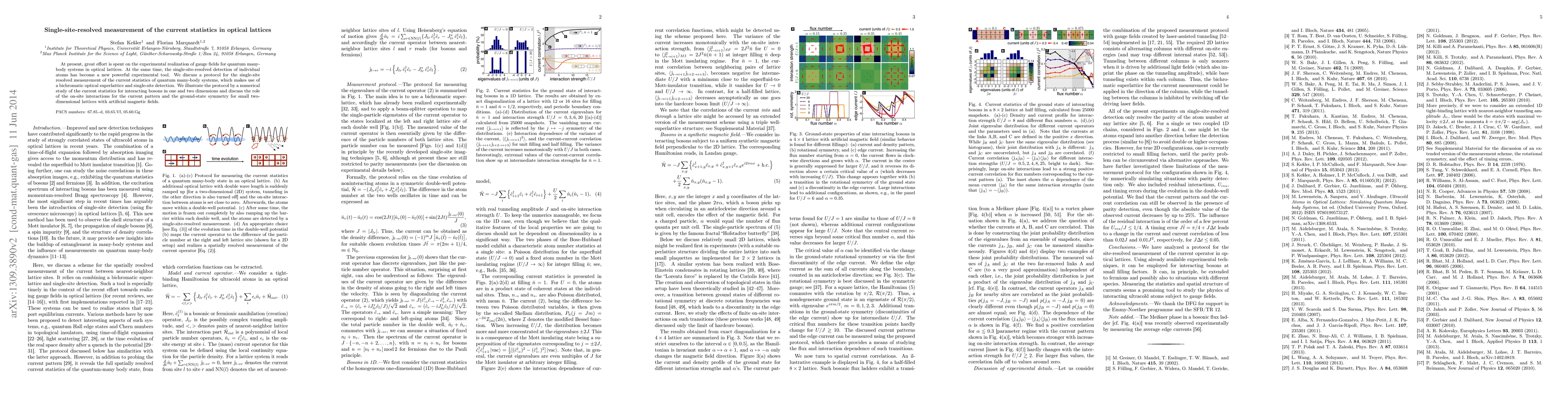 At present, great effort is spent on the experimental realization of gauge fields for quantum many-body systems in optical lattices. At the same time, the single-site-resolved detection of individual atoms has become a new powerful experimental tool. We discuss a protocol for the single-site resolved measurement of the current statistics of quantum many-body systems, which makes use of a bichromatic optical superlattice and single-site detection. We illustrate the protocol by a numerical study of the current statistics for interacting bosons in one and two dimensions and discuss the role of the on-site interactions for the current pattern and the ground-state symmetry for small two-dimensional lattices with artificial magnetic fields.