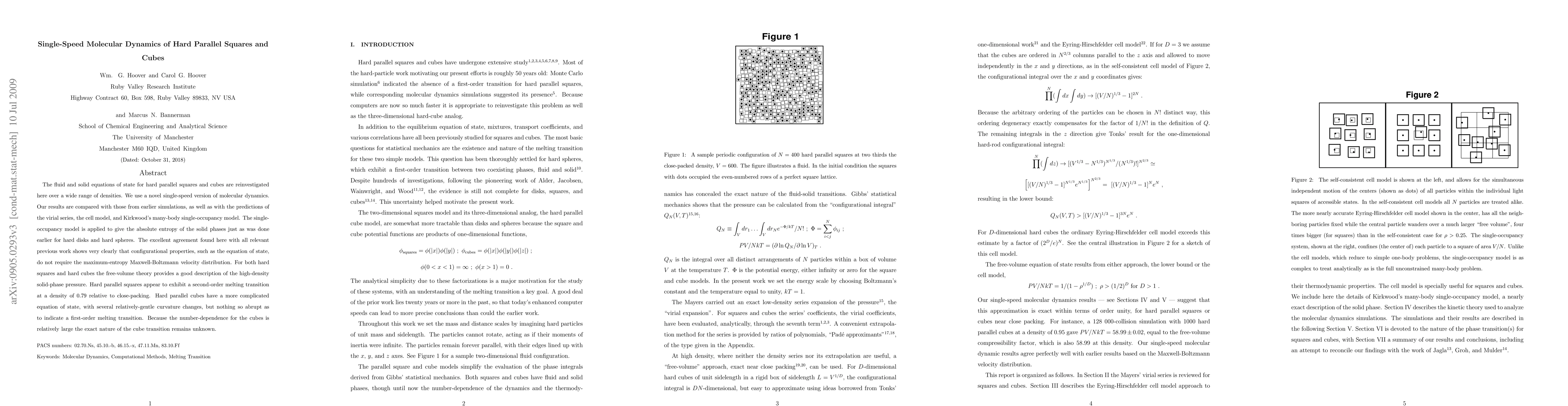 The fluid and solid equations of state for hard parallel squares and cubes are reinvestigated here over a wide range of densities. We use a novel single-speed version of molecular dynamics. Our results are compared with those from earlier simulations, as well as with the predictions of the virial series, the cell model, and Kirkwood's many-body single-occupancy model. The single-occupancy model is applied to give the absolute entropy of the solid phases just as was done earlier for hard disks and hard spheres. The excellent agreement found here with all relevant previous work shows very clearly that configurational properties, such as the equation of state, do not require the maximum-entropy Maxwell-Boltzmann velocity distribution. For both hard squares and hard cubes the free-volume theory provides a good description of the high-density solid-phase pressure. Hard parallel squares appear to exhibit a second-order melting transition at a density of 0.79 relative to close-packing. Hard parallel cubes have a more complicated equation of state, with several relatively-gentle curvature changes, but nothing so abrupt as to indicate a first-order melting transition. Because the number-dependence for the cubes is relatively large the exact nature of the cube transition remains unknown.