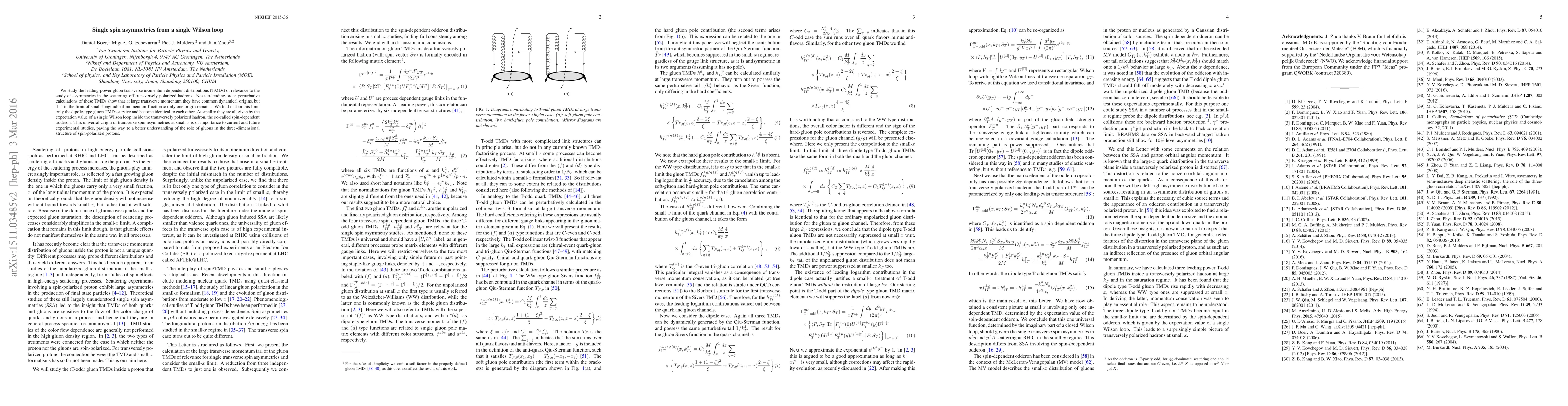 We study the leading-power gluon transverse momentum dependent distributions (TMDs) of relevance to the study of asymmetries in the scattering off transversely polarized hadrons. Next-to-leading-order perturbative calculations of these TMDs show that at large transverse momentum they have common dynamical origins, but that in the limit of small longitudinal momentum fraction $x$ only one origin remains. We find that in this limit only the dipole-type gluon TMDs survive and become identical to each other. At small $x$ they are all given by the expectation value of a single Wilson loop inside the transversely polarized hadron, the so-called spin-dependent odderon. This universal origin of transverse spin asymmetries at small $x$ is of importance to current and future experimental studies, paving the way to a better understanding of the role of gluons in the three-dimensional structure of spin-polarized protons.