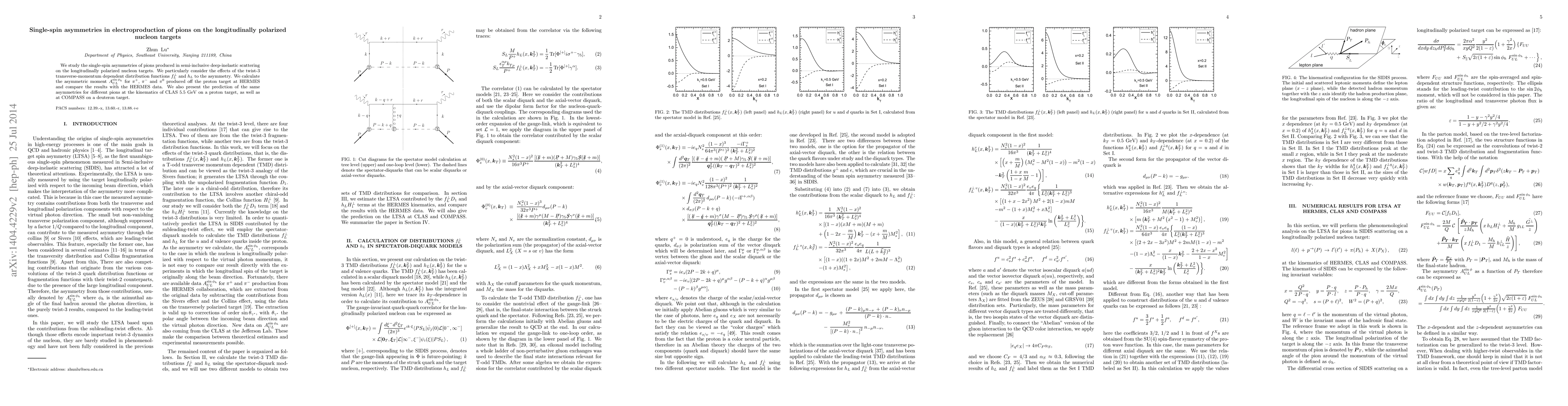 This paper investigates single-spin asymmetries in pion electroproduction from longitudinally polarized nucleon targets, focusing on twist-3 TMD distribution functions. It compares calculated asymmetries for $\pi^+$, $\pi^-$, and $\pi^0$ from HERMES data and predicts similar asymmetries for CLAS and COMPASS experiments.