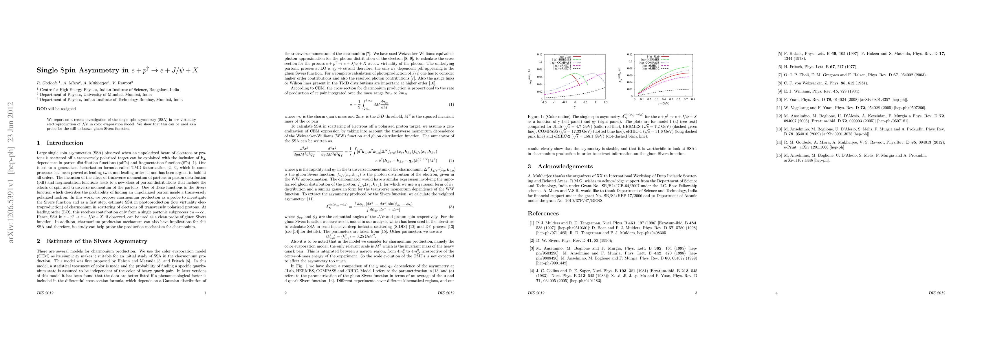 We report on a recent investigation of the single spin asymmetry (SSA) in low virtuality electroproduction of $J/\psi$ in color evaporation model. We show that this can be used as a probe for the still unknown gluon Sivers function.