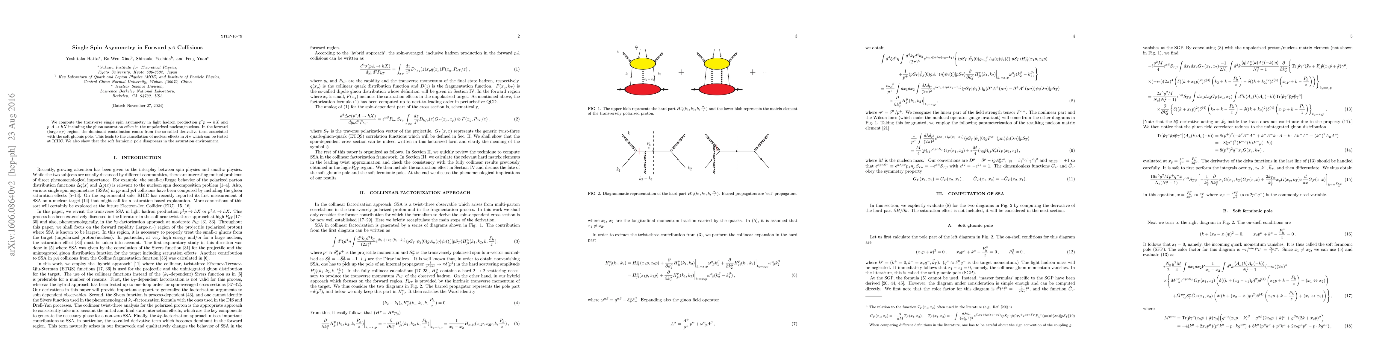 We compute the transverse single spin asymmetry in light hadron production $p^\uparrow p\to hX$ and $p^\uparrow A\to hX$ including the gluon saturation effect in the unpolarized nucleon/nucleus. In the forward (large-$x_F$) region, the dominant contribution comes from the so-called derivative term associated with the soft gluonic pole. This leads to the cancellation of nuclear effects in $A_N$ which can be tested at RHIC. We also show that the soft fermionic pole disappears in the saturation environment.
