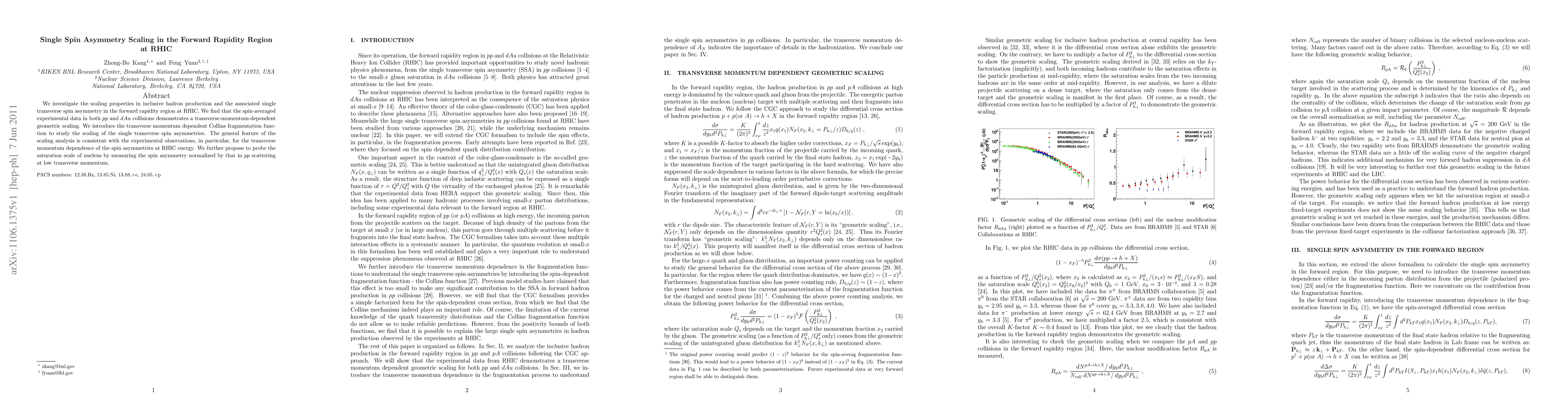 This paper examines the scaling properties of inclusive hadron production and single transverse spin asymmetry in forward rapidity at RHIC, finding transverse-momentum-dependent geometric scaling. It proposes using the Collins fragmentation function to study these asymmetries and suggests measuring the spin asymmetry normalized by $pp$ scattering to probe the saturation scale of a nucleus.