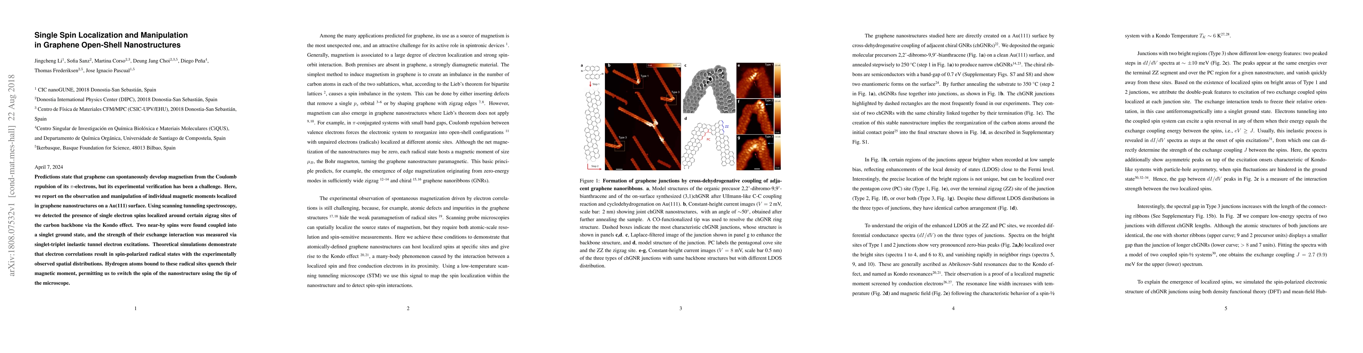 Predictions state that graphene can spontaneously develop magnetism from the Coulomb repulsion of its $\pi$-electrons, but its experimental verification has been a challenge. Here, we report on the observation and manipulation of individual magnetic moments localized in graphene nanostructures on a Au(111) surface. Using scanning tunneling spectroscopy, we detected the presence of single electron spins localized around certain zigzag sites of the carbon backbone via the Kondo effect. Two near-by spins were found coupled into a singlet ground state, and the strength of their exchange interaction was measured via singlet-triplet inelastic tunnel electron excitations. Theoretical simulations demonstrate that electron correlations result in spin-polarized radical states with the experimentally observed spatial distributions. Hydrogen atoms bound to these radical sites quench their magnetic moment, permitting us to switch the spin of the nanostructure using the tip of the microscope.