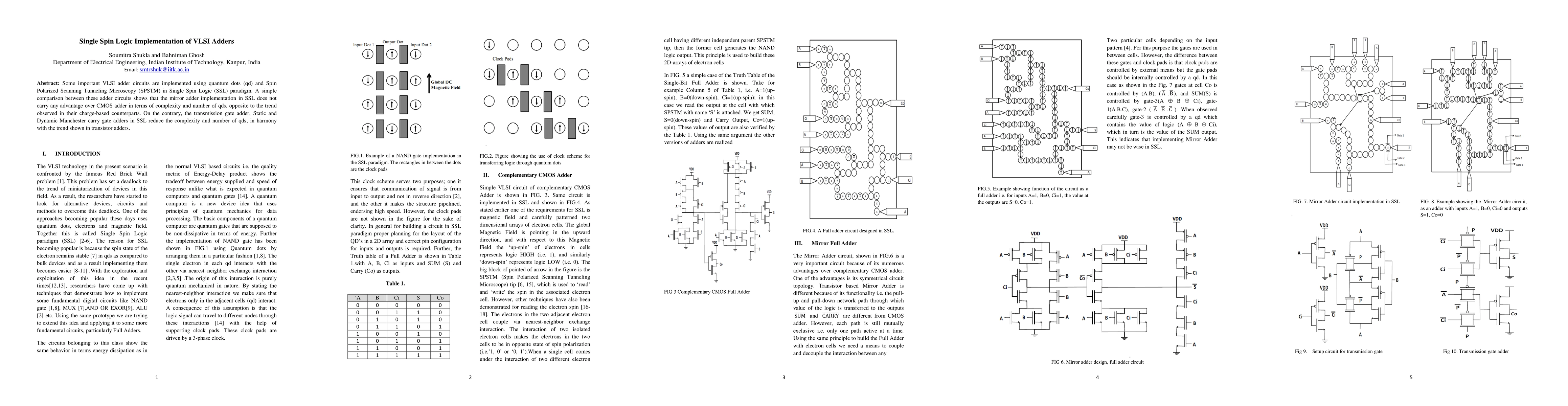 A study on VLSI adder circuits implemented with Single Spin Logic found that mirror adders offer no advantages over CMOS adders in terms of complexity, while transmission gate and Manchester carry gates showed reduced complexity and qd usage.
