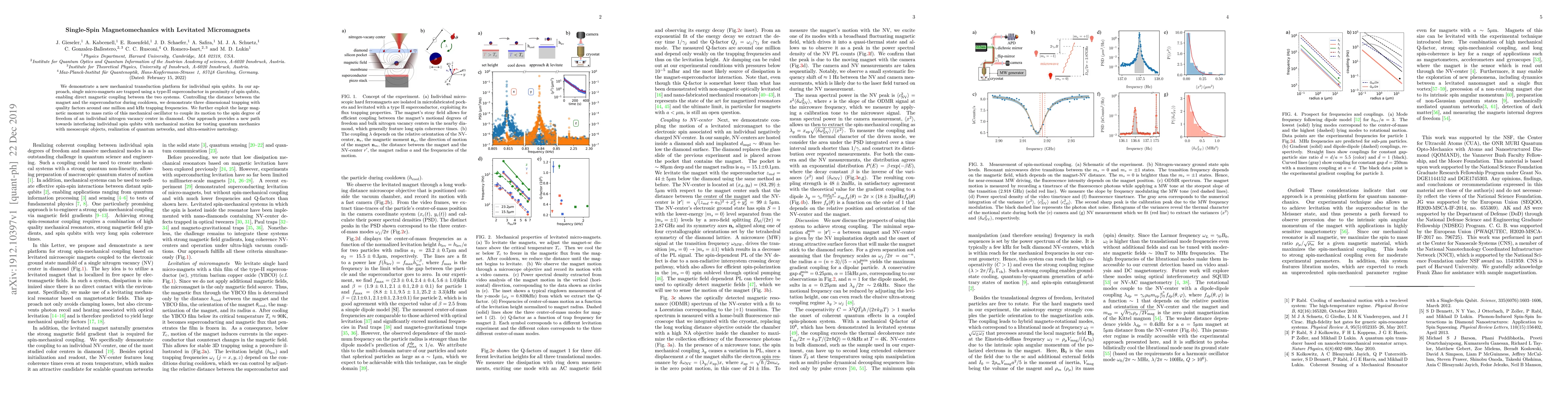 We demonstrate a new mechanical transduction platform for individual spin qubits. In our approach, single micro-magnets are trapped using a type-II superconductor in proximity of spin qubits, enabling direct magnetic coupling between the two systems. Controlling the distance between the magnet and the superconductor during cooldown, we demonstrate three dimensional trapping with quality factors around one million and kHz trapping frequencies. We further exploit the large magnetic moment to mass ratio of this mechanical oscillator to couple its motion to the spin degree of freedom of an individual nitrogen vacancy center in diamond. Our approach provides a new path towards interfacing individual spin qubits with mechanical motion for testing quantum mechanics with mesoscopic objects, realization of quantum networks, and ultra-sensitive metrology.