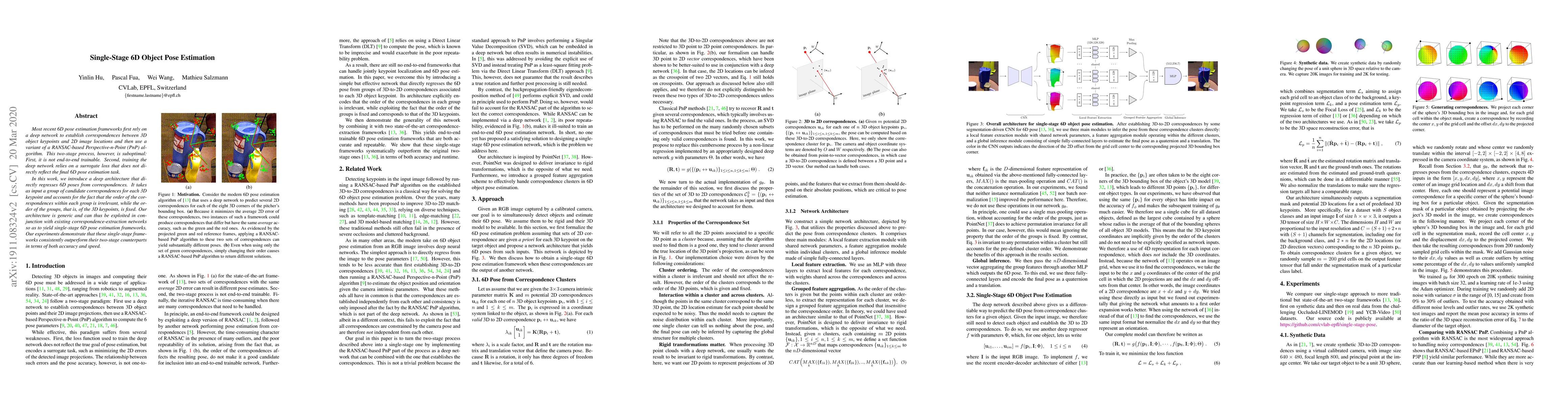 This paper proposes a novel deep architecture for single-stage 6D object pose estimation that directly regresses poses from correspondences, eliminating the need for a separate PnP algorithm. The method outperforms traditional two-stage frameworks in both accuracy and speed.
