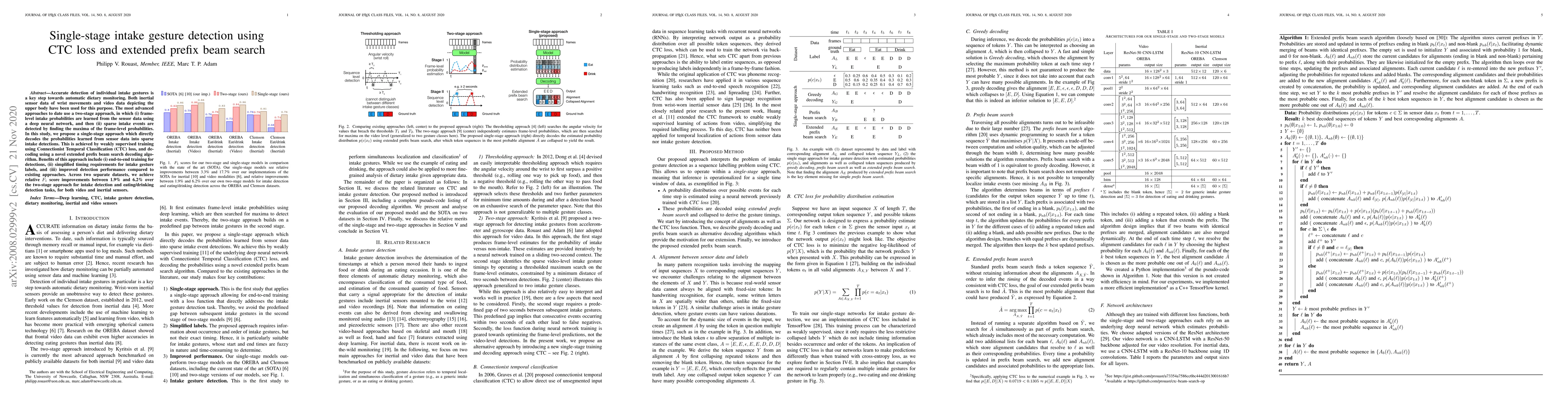 Accurate detection of individual intake gestures is a key step towards automatic dietary monitoring. Both inertial sensor data of wrist movements and video data depicting the upper body have been used for this purpose. The most advanced approaches to date use a two-stage approach, in which (i) frame-level intake probabilities are learned from the sensor data using a deep neural network, and then (ii) sparse intake events are detected by finding the maxima of the frame-level probabilities. In this study, we propose a single-stage approach which directly decodes the probabilities learned from sensor data into sparse intake detections. This is achieved by weakly supervised training using Connectionist Temporal Classification (CTC) loss, and decoding using a novel extended prefix beam search decoding algorithm. Benefits of this approach include (i) end-to-end training for detections, (ii) simplified timing requirements for intake gesture labels, and (iii) improved detection performance compared to existing approaches. Across two separate datasets, we achieve relative $F_1$ score improvements between 1.9% and 6.2% over the two-stage approach for intake detection and eating/drinking detection tasks, for both video and inertial sensors.