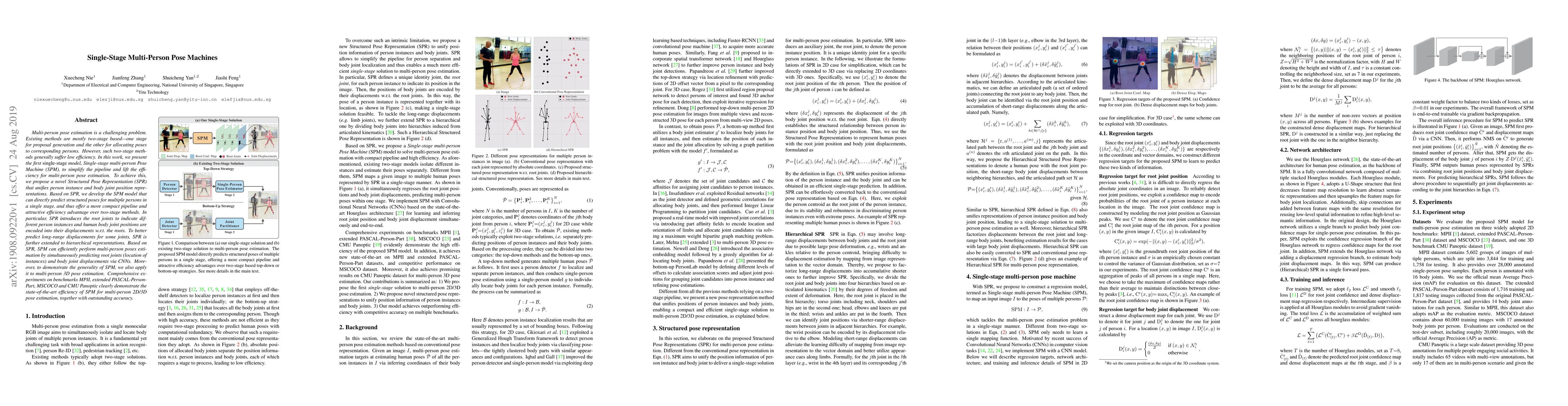 This paper introduces a single-stage model called Single-stage multi-person Pose Machine (SPM) for efficient multi-person pose estimation, utilizing a novel Structured Pose Representation (SPR) that unifies person instance and body joint representations. The SPM model directly predicts structured poses in one stage, achieving better efficiency and accuracy compared to traditional two-stage methods.