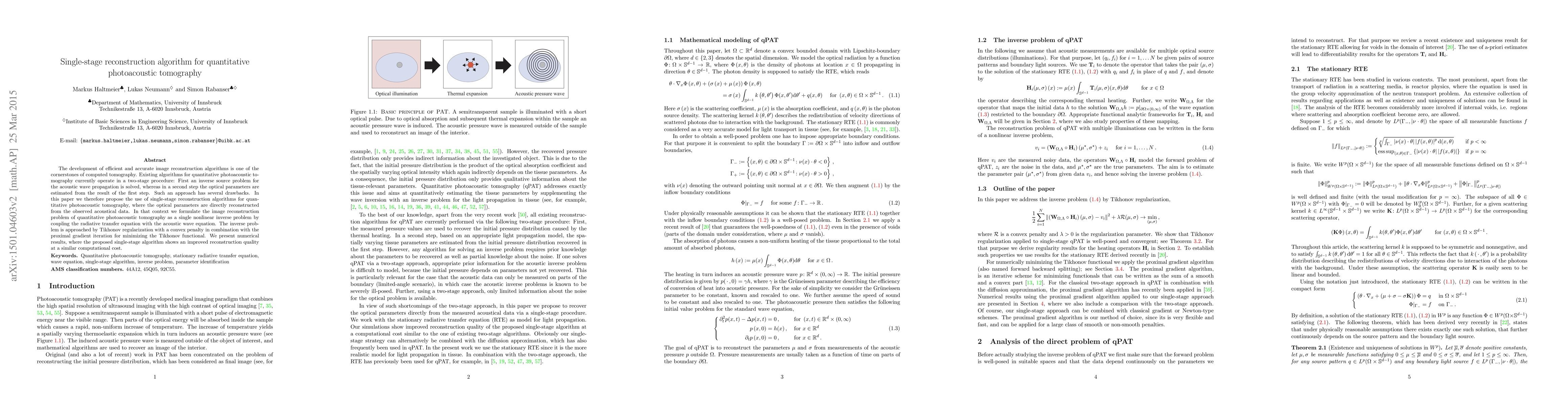 This paper proposes a single-stage reconstruction algorithm for quantitative photoacoustic tomography, directly reconstructing optical parameters from acoustic data, thus eliminating the need for a two-stage process. The method employs Tikhonov regularization and proximal gradient iteration to solve the coupled radiative transfer and acoustic wave equations, demonstrating improved reconstruction quality with comparable computational efficiency.