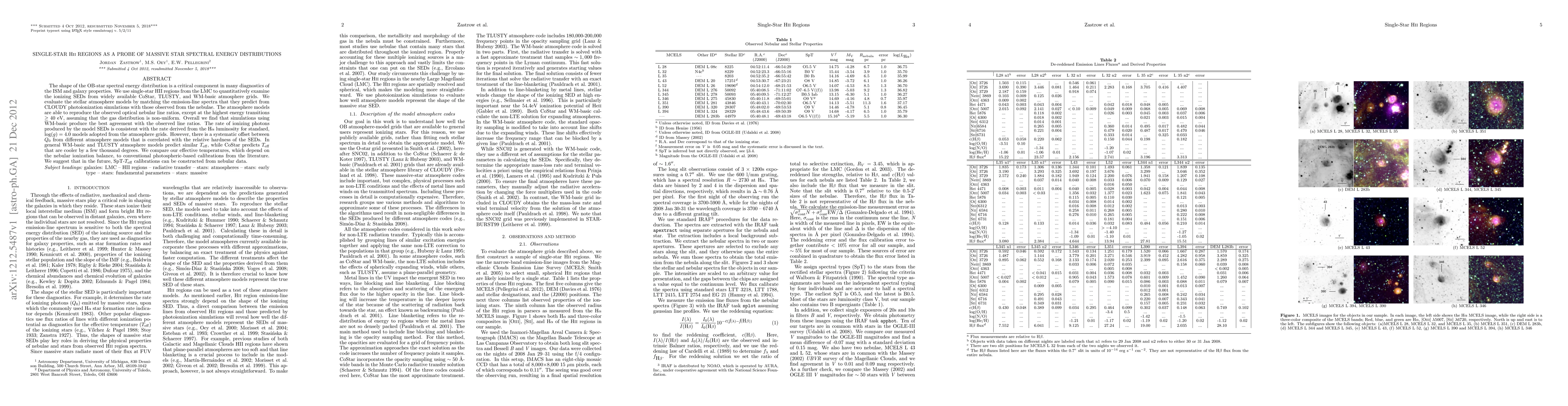 The shape of the OB-star spectral energy distribution is a critical component in many diagnostics of the ISM and galaxy properties. We use single-star HII regions from the LMC to quantitatively examine the ionizing SEDs from widely available CoStar, TLUSTY, and WM-basic atmosphere grids. We evaluate the stellar atmosphere models by matching the emission-line spectra that they predict from CLOUDY photoionization simulations with those observed from the nebulae. The atmosphere models are able to reproduce the observed optical nebular line ratios, except at the highest energy transitions > 40 eV, assuming that the gas distribution is non-uniform. Overall we find that simulations using WM-basic produce the best agreement with the observed line ratios. The rate of ionizing photons produced by the model SEDs is consistent with the rate derived from the \Halpha\ luminosity for standard, log(g) = 4.0 models adopted from the atmosphere grids. However, there is a systematic offset between the rate of ionizing photons from different atmosphere models that is correlated with the relative hardness of the SEDs. In general WM-basic and TLUSTY atmosphere models predict similar effective temperatures, while CoStar predicts effective temperatures that are cooler by a few thousand degrees. We compare our effective temperatures, which depend on the nebular ionization balance, to conventional photospheric-based calibrations from the literature. We suggest that in the future, spectral type to effective temperature calibrations can be constructed from nebular data.