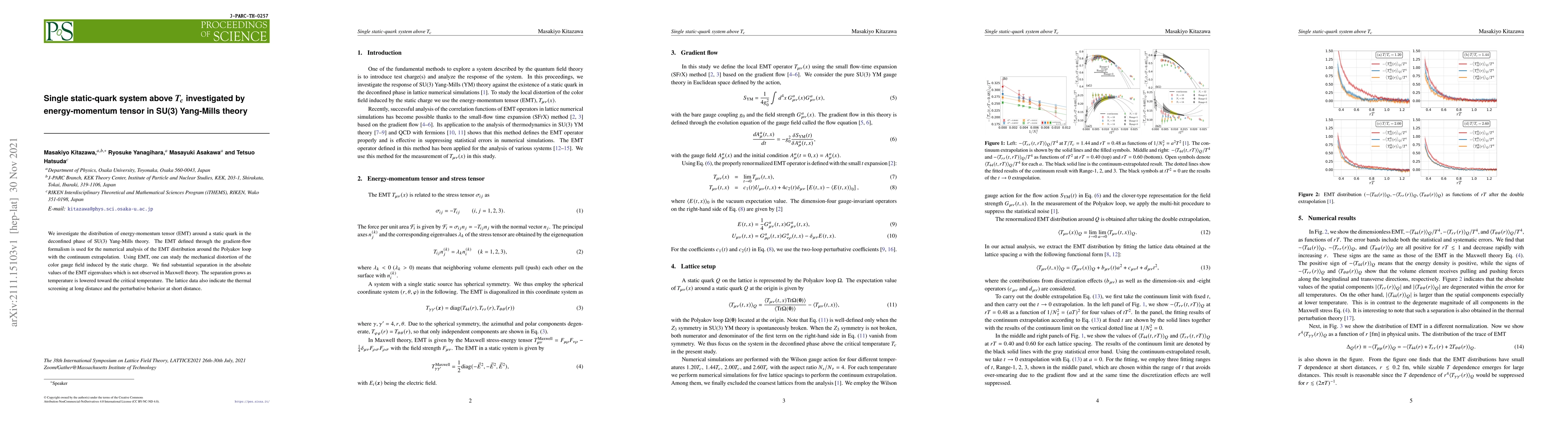 We investigate the distribution of energy-momentum tensor (EMT) around a static quark in the deconfined phase of SU(3) Yang-Mills theory. The EMT defined through the gradient-flow formalism is used for the numerical analysis of the EMT distribution around the Polyakov loop with the continuum extrapolation. Using EMT, one can study the mechanical distortion of the color gauge field induced by the static charge. We find substantial separation in the absolute values of the EMT eigenvalues which is not observed in Maxwell theory. The separation grows as temperature is lowered toward the critical temperature. The lattice data also indicate the thermal screening at long distance and the perturbative behavior at short distance.
