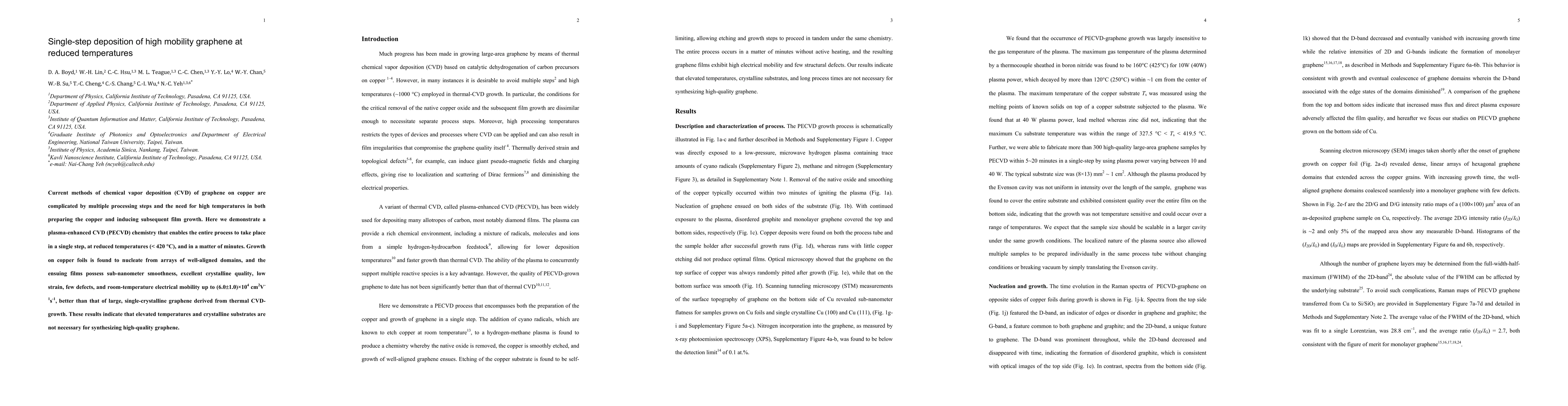 This paper presents a novel plasma-enhanced CVD method for single-step, low-temperature deposition of high-mobility graphene on copper, achieving superior electrical properties compared to traditional thermal CVD methods. The process occurs at temperatures below 420°C and results in films with exceptional smoothness, low defect density, and high room temperature electrical mobility.
