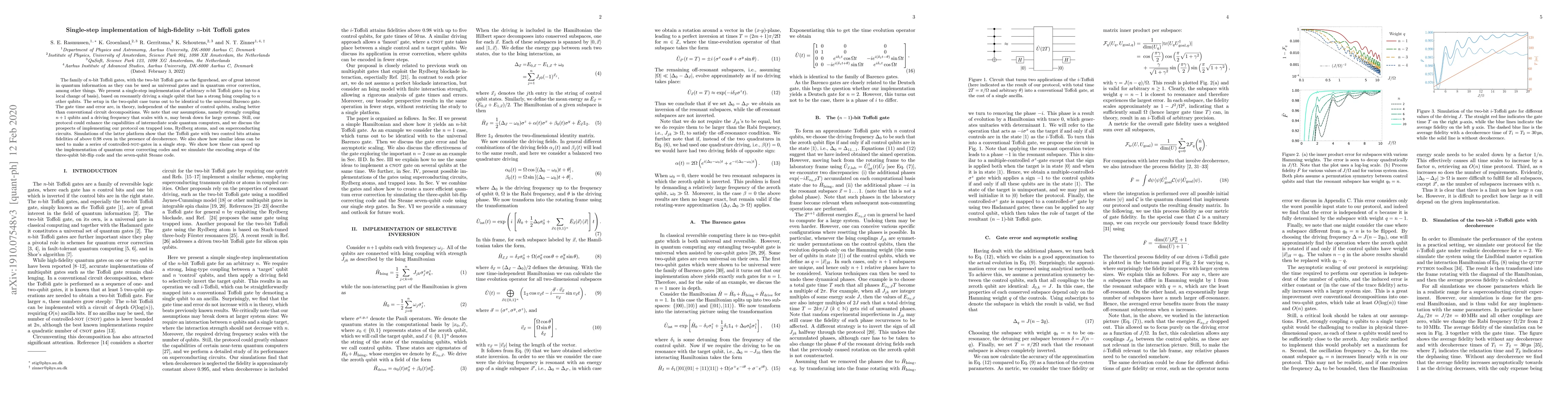 This paper presents a single-step implementation of high-fidelity $n$-bit Toffoli gates using resonantly driven qubits, which scales better than conventional methods. The approach, applicable to trapped ions, Rydberg atoms, and superconducting circuits, achieves high fidelity even with decoherence, and can also implement controlled-NOT gates and quantum error correction codes efficiently.