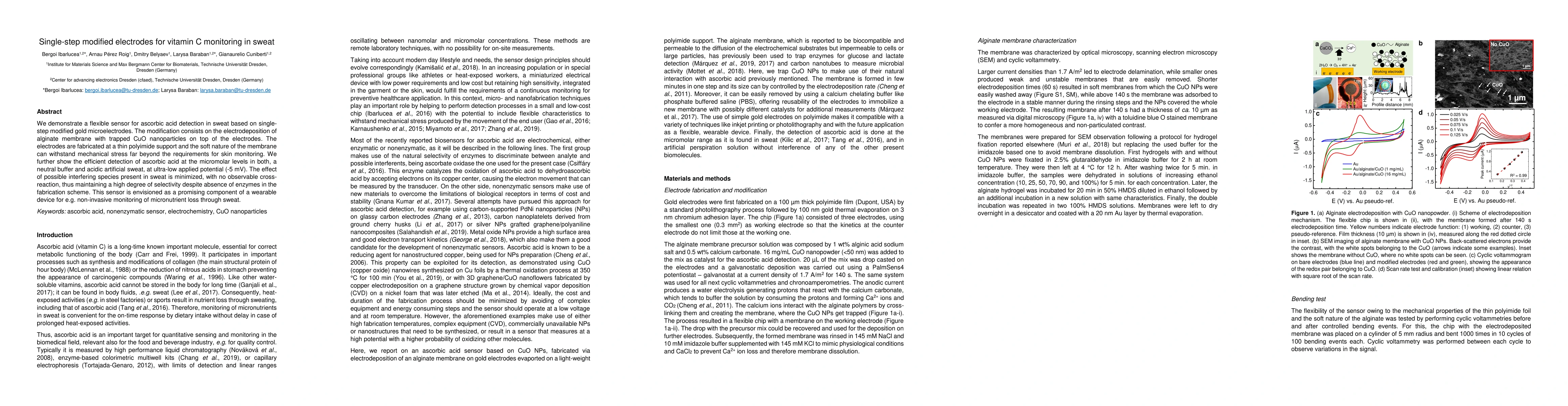We demonstrate a flexible sensor for ascorbic acid detection in sweat based on single-step modified gold microelectrodes. The modification consists on the electrodeposition of alginate membrane with trapped CuO nanoparticles on top of the electrodes. The electrodes are fabricated at a thin polyimide support and the soft nature of the membrane can withstand mechanical stress far beyond the requirements for skin monitoring. We further show the efficient detection of ascorbic acid at the micromolar levels in both, a neutral buffer and acidic artificial sweat, at ultra-low applied potential (-5 mV). The effect of possible interfering species present in sweat is minimized, with no observable cross-reaction, thus maintaining a high degree of selectivity despite absence of enzymes in the fabrication scheme. This sensor is envisioned as a promising component of a wearable device for e.g. non-invasive monitoring of micronutrient loss through sweat.