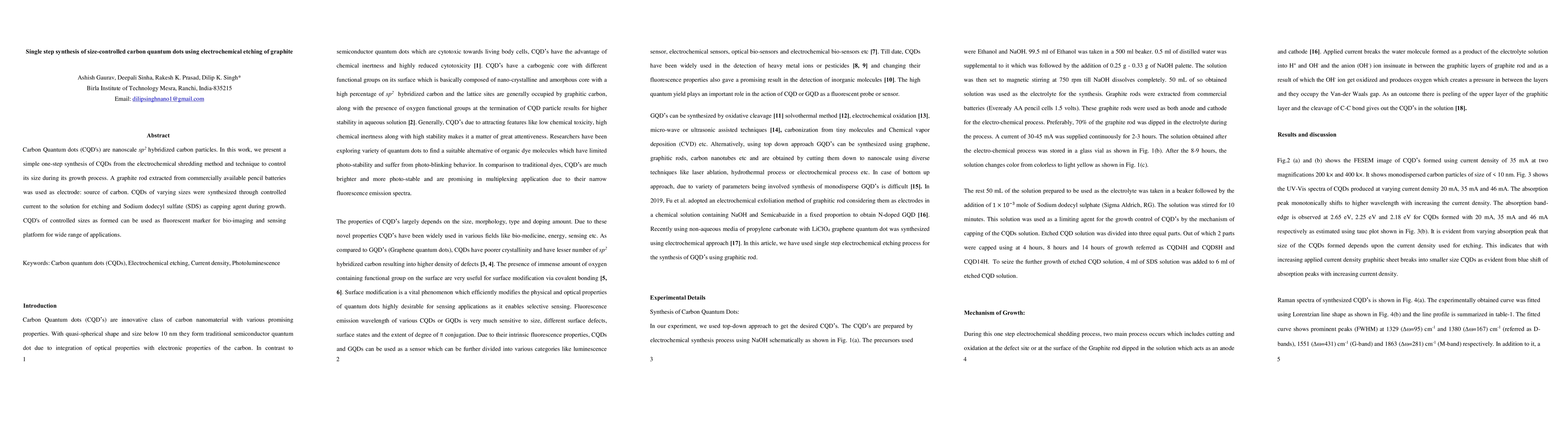 Carbon Quantum dots (CQD's) are nanoscale sp2 hybridized carbon particles. In this work, we present a simple one-step synthesis of CQDs from the electrochemical shredding method and technique to control its size during its growth process. A graphite rod extracted from commercially available pencil batteries was used as electrode: source of carbon. CQDs of varying sizes were synthesized through controlled current to the solution for etching and Sodium dodecyl sulfate (SDS) as capping agent during growth. CQD's of controlled sizes as formed can be used as fluorescent marker for bio-imaging and sensing platform for wide range of applications.
