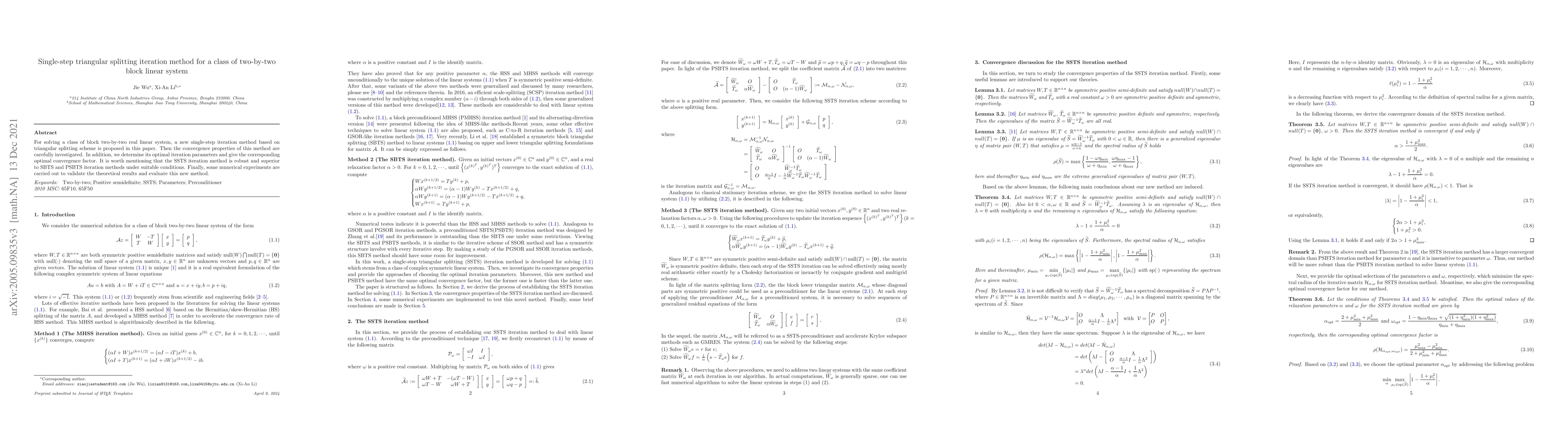 For solving a class of block two-by-two real linear system, a new single-step iteration method based on triangular splitting scheme is proposed in this paper. Then the convergence properties of this method are carefully investigated. In addition, we determine its optimal iteration parameters and give the corresponding optimal convergence factor. It is worth mentioning that the SSTS iteration method is robust and superior to SBTS and PSBTS iteration methods under suitable conditions. Finally, some numerical experiments are carried out to validate the theoretical results and evaluate this new method.