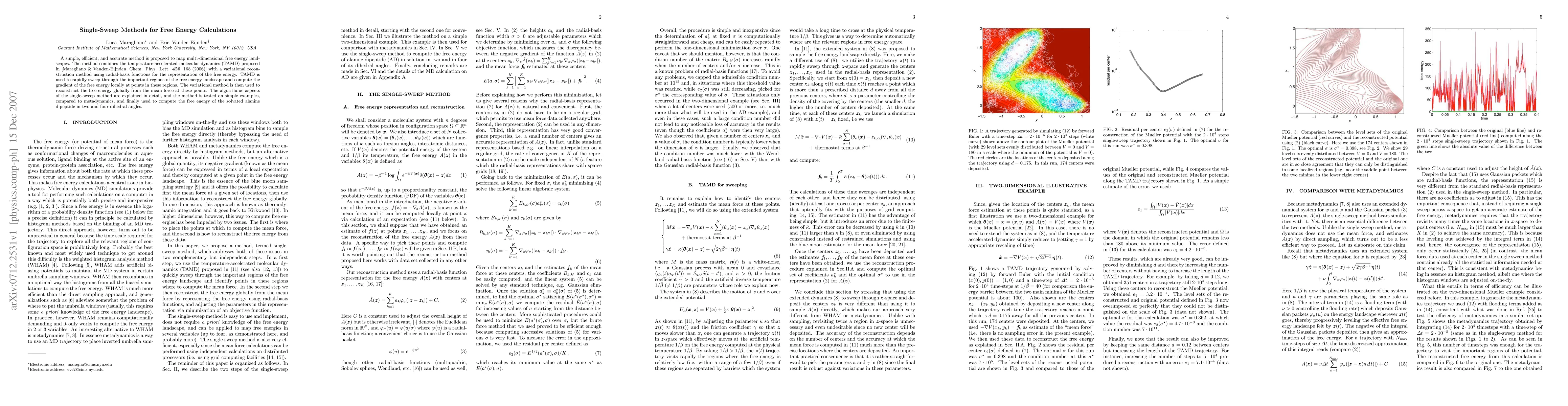 A simple, efficient, and accurate method is proposed to map multi-dimensional free energy landscapes. The method combines the temperature-accelerated molecular dynamics (TAMD) proposed in [Maragliano & Vanden-Eijnden, Chem. Phys. Lett. 426, 168 (2006)] with a variational reconstruction method using radial-basis functions for the representation of the free energy. TAMD is used to rapidly sweep through the important regions of the free energy landscape and compute the gradient of the free energy locally at points in these regions. The variational method is then used to reconstruct the free energy globally from the mean force at these points. The algorithmic aspects of the single-sweep method are explained in detail, and the method is tested on simple examples, compared to metadynamics, and finally used to compute the free energy of the solvated alanine dipeptide in two and four dihedral angles.