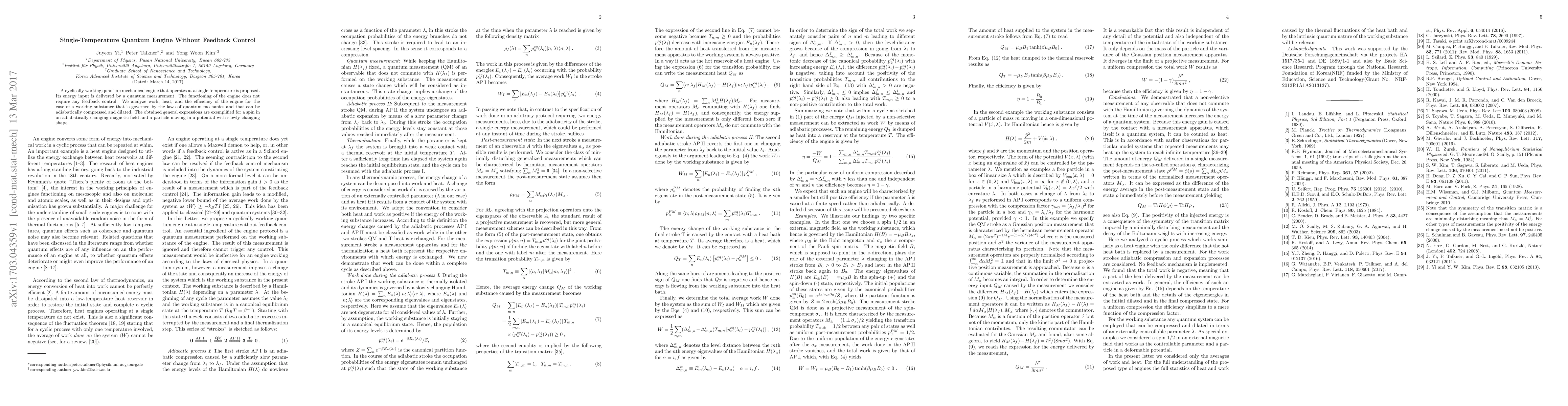 This paper proposes a single-temperature quantum engine that operates without feedback control, utilizing quantum measurement for energy input. The study analyzes work, heat, and efficiency for quantum mechanical systems, exemplified by a spin in a magnetic field and a particle in a slowly changing potential.