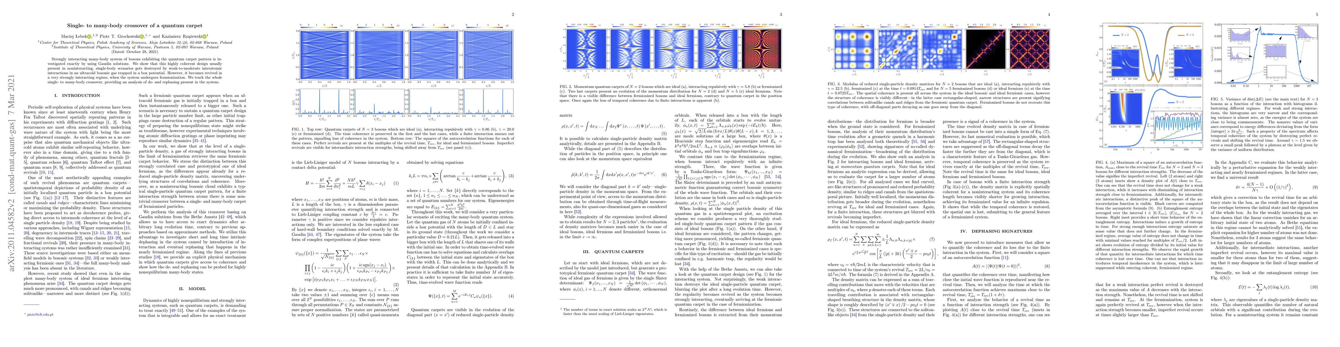 Strongly interacting many-body system of bosons exhibiting the quantum carpet pattern is investigated exactly by using Gaudin solutions. We show that this highly coherent design usually present in noninteracting, single-body scenarios gets destroyed by weak-to-moderate interatomic interactions in an ultracold bosonic gas trapped in a box potential. However, it becomes revived in a very strongly interacting regime, when the system undergoes fermionization. We track the whole single- to many-body crossover, providing an analysis of de- and rephasing present in the system.