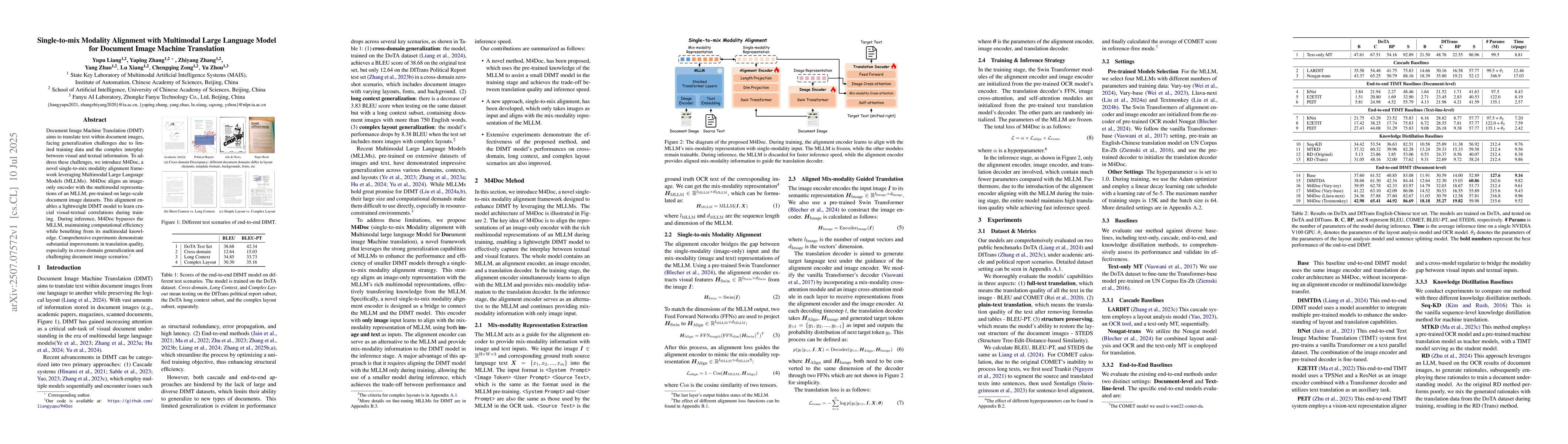 The research introduces M4Doc, a single-to-mix modality alignment framework using Multimodal Large Language Models (MLLMs) for Document Image Machine Translation (DIMT). M4Doc aligns an image-only encoder with MLLM representations, enabling a lightweight DIMT model to learn visual-textual correlations during training while maintaining computational efficiency during inference.
