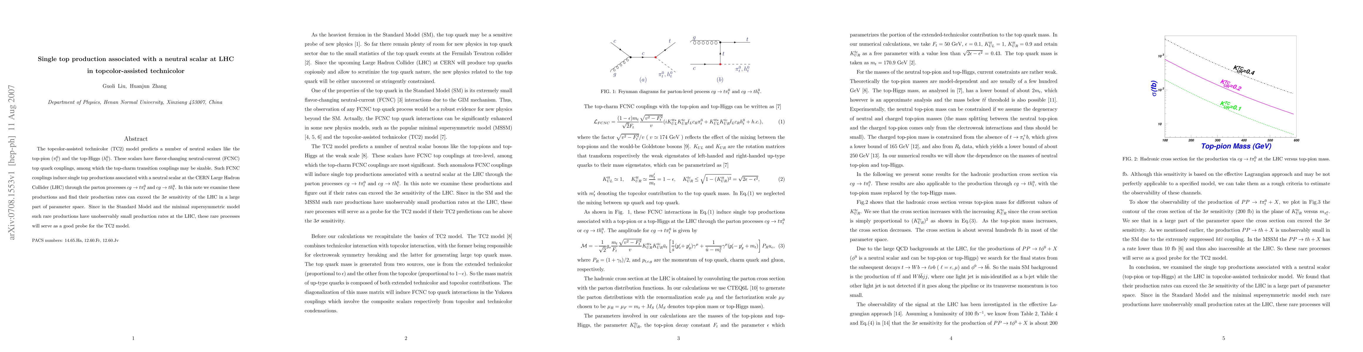 The topcolor-assisted technicolor (TC2) model predicts a number of neutral scalars like the top-pion ($\pi^0_t$) and the top-Higgs ($h^0_t$). These scalars have flavor-changing neutral-current (FCNC) top quark couplings, among which the top-charm transition couplings may be sizable. Such FCNC couplings induce single top productions associated with a neutral scalar at the CERN Large Hadron Collider (LHC) through the parton processes $cg \to t \pi_t^0$ and $cg \to t h_t^0$. In this note we examine these productions and find their production rates can exceed the $3\sigma$ sensitivity of the LHC in a large part of parameter space. Since in the Standard Model and the minimal supersymmetric model such rare productions have unobservably small production rates at the LHC, these rare processes will serve as a good probe for the TC2 model.