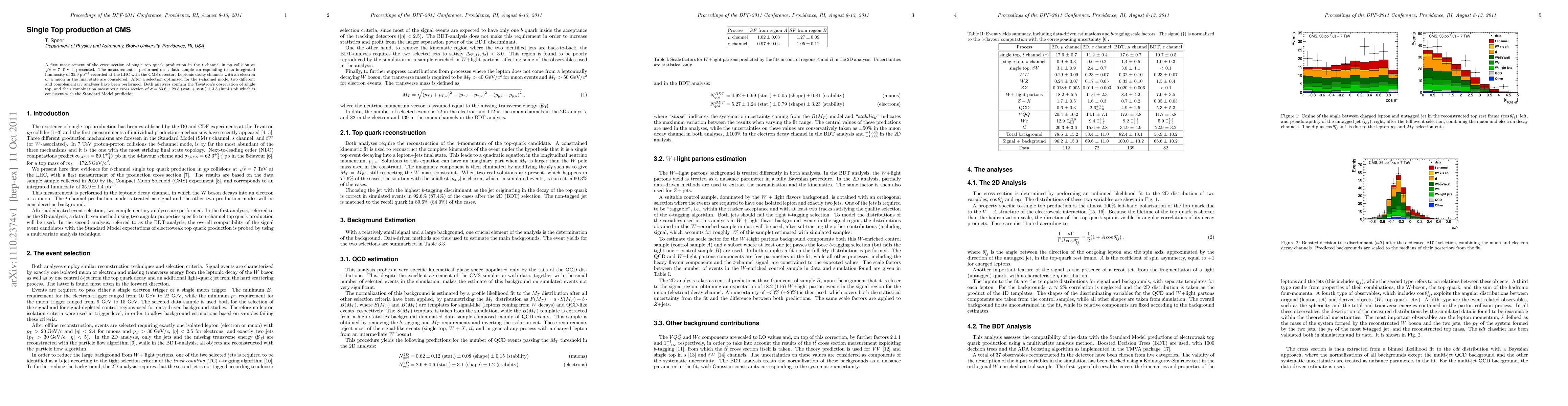 A first measurement of the cross section of single top quark production in the t channel in pp collision at sqrt(s)=7 TeV is presented. The measurement is performed on a data sample corresponding to an integrated luminosity of 35.9 pb^-1 recorded at the LHC with the CMS detector. Leptonic decay channels with an electron or a muon in the final state are considered. After a selection optimized for the t-channel mode, two different and complementary analyses have been performed. Both analyses confirm the Tevatron's observation of single top, and their combination measures a cross section of sigma = 83.6 +/- 29.8(stat.+syst.) +/- 3.3 (lumi.) pb, which is consistent with the Standard Model prediction.