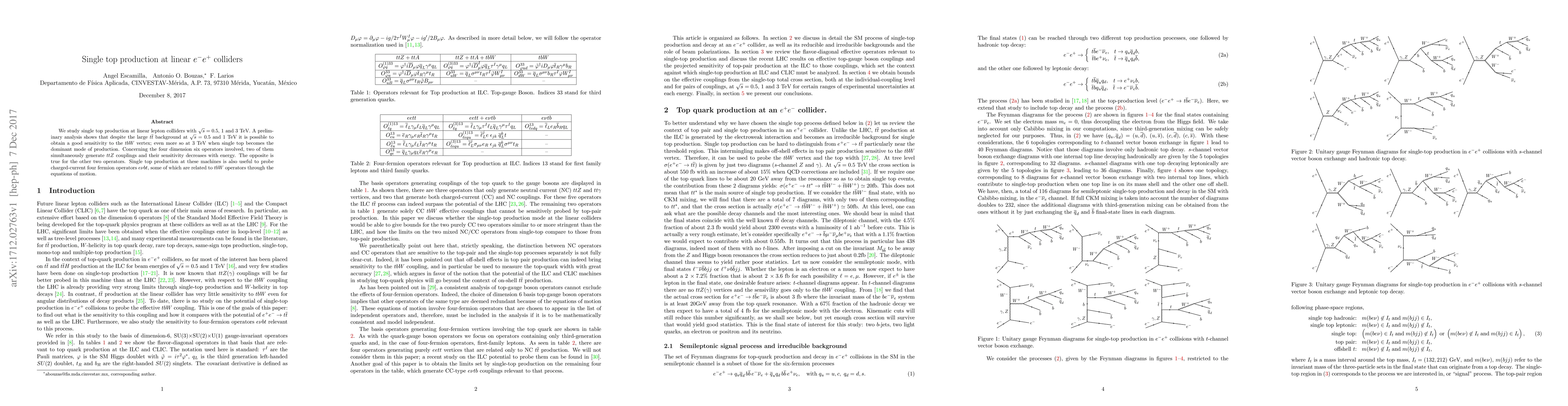 Summary: The study explores single top production at linear $e^-e^+$ colliders across different energies, demonstrating good sensitivity to the $tbW$ vertex despite $t\bar t$ background. Higher energy improves the dominance of single top production and enhances the probe of charged-current four fermion operators, particularly those related to $tbW$ interactions.