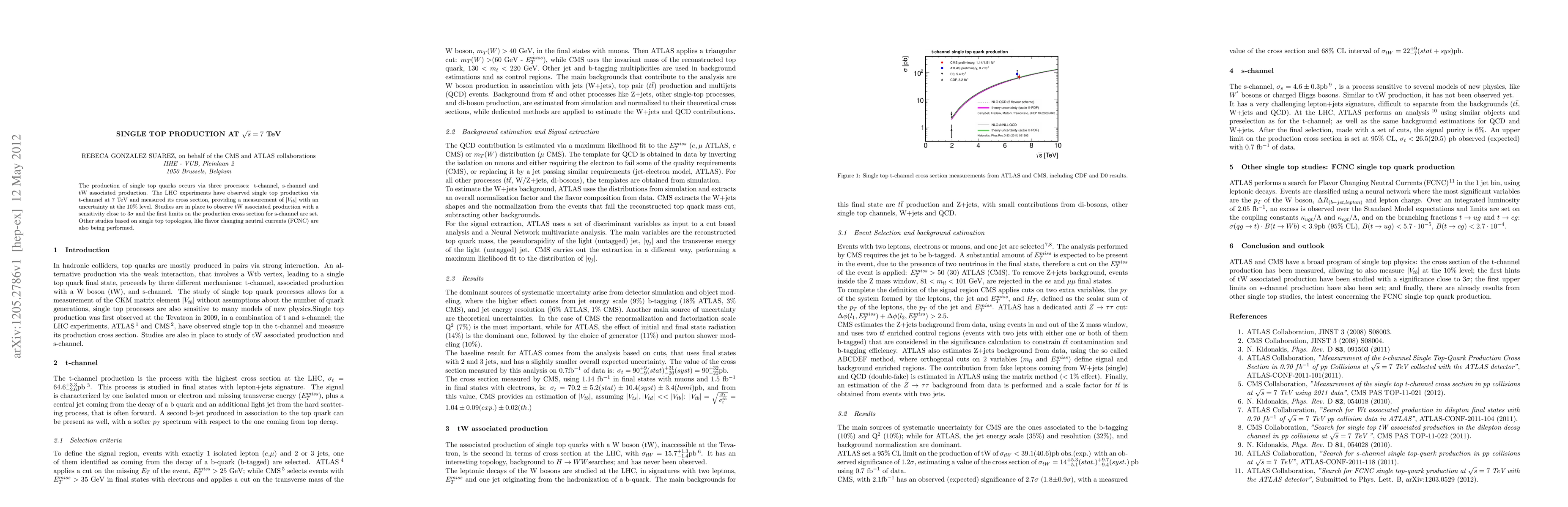 The production of single top quarks occurs via three processes: t-channel, s-channel and tW associated production. The LHC experiments have observed single top production via t-channel at 7 TeV and measured its cross section, providing a measurement of |Vtb| with an uncertainty at the 10% level. Studies are in place to observe tW associated production with a sensitivity close to 3sigma and the first limits on the production cross section for s-channel are set. Other studies based on single top topologies, like flavor changing neutral currents (FCNC) are also being performed.