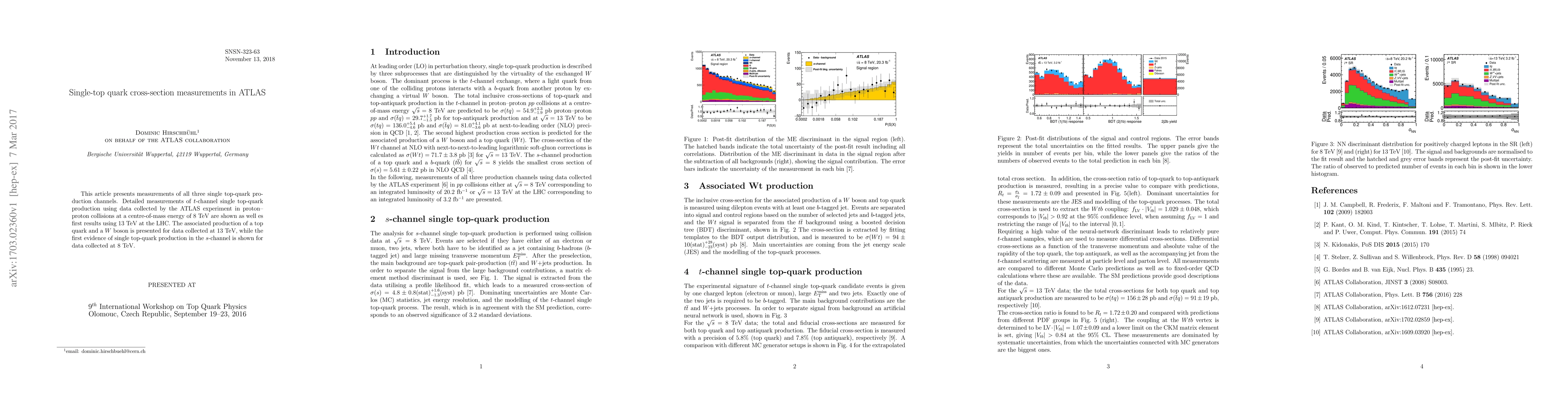 This article presents measurements of all three single top-quark production channels. Detailed measurements of $t$-channel single top-quark production using data collected by the ATLAS experiment in proton--proton collisions at a centre-of-mass energy of 8 TeV are shown as well es first results using 13 TeV at the LHC. The associated production of a top quark and a $W$ boson is presented for data collected at 13 TeV, while the first evidence of single top-quark production in the $s$-channel is shown for data collected at 8 TeV.