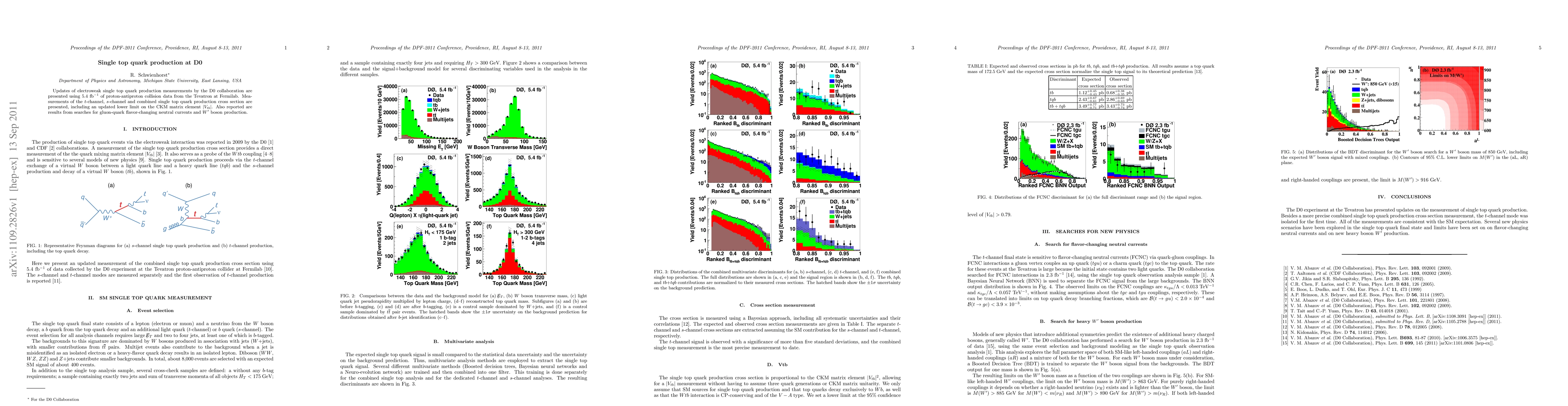 Updates of electroweak single top quark production measurements by the D0 collaboration are presented using 5.4fb^-1 of proton-antiproton collision data from the Tevatron at Fermilab. Measurements of the t-channel, s-channel and combined single top quark production cross section are presented, including an updated lower limit on the CKM matrix element |V_tb|. Also reported are results from searches for gluon-quark flavor-changing neutral currents and W' boson production.