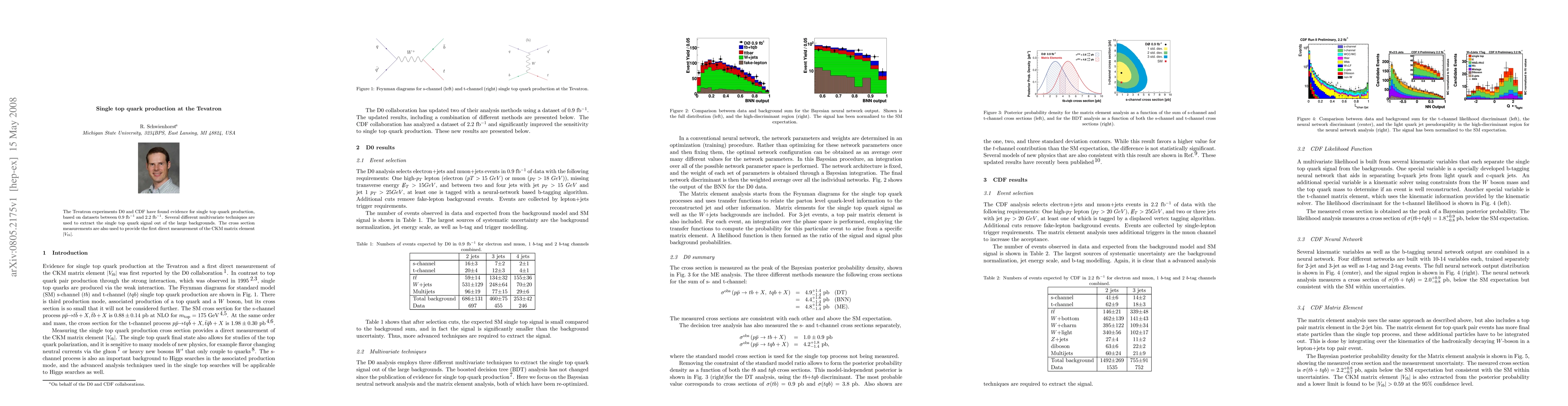The Tevatron experiments D0 and CDF have found evidence for single top quark production, based on datasets between 0.9fb-1 and 2.2fb^-1. Several different multivariate techniques are used to extract the single top quark signal out of the large backgrounds. The cross section measurements are also used to provide the first direct measurement of the CKM matrix element |Vtb|.
