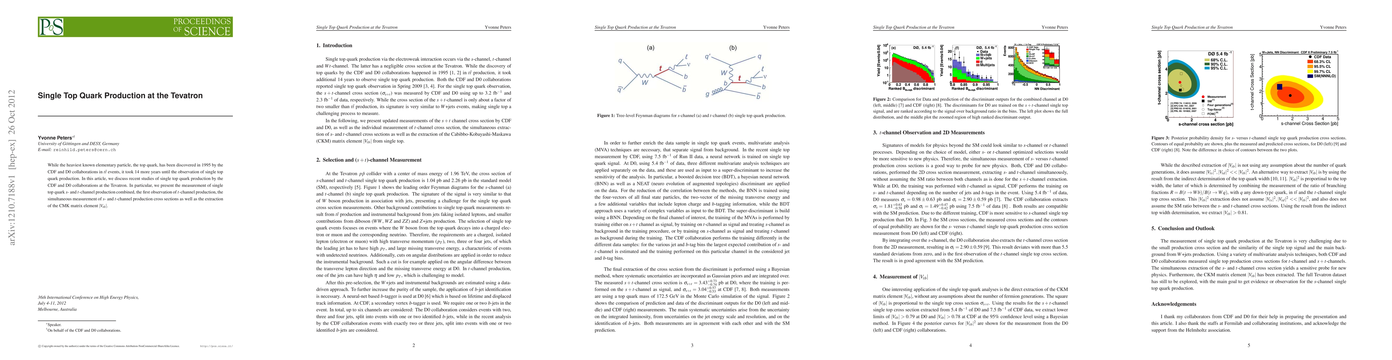 This paper discusses recent findings from the CDF and D0 collaborations on single top quark production at the Tevatron, including the first observation of t-channel production and the combined measurement of s- and t-channel production cross sections, alongside the extraction of the |Vtb| matrix element.