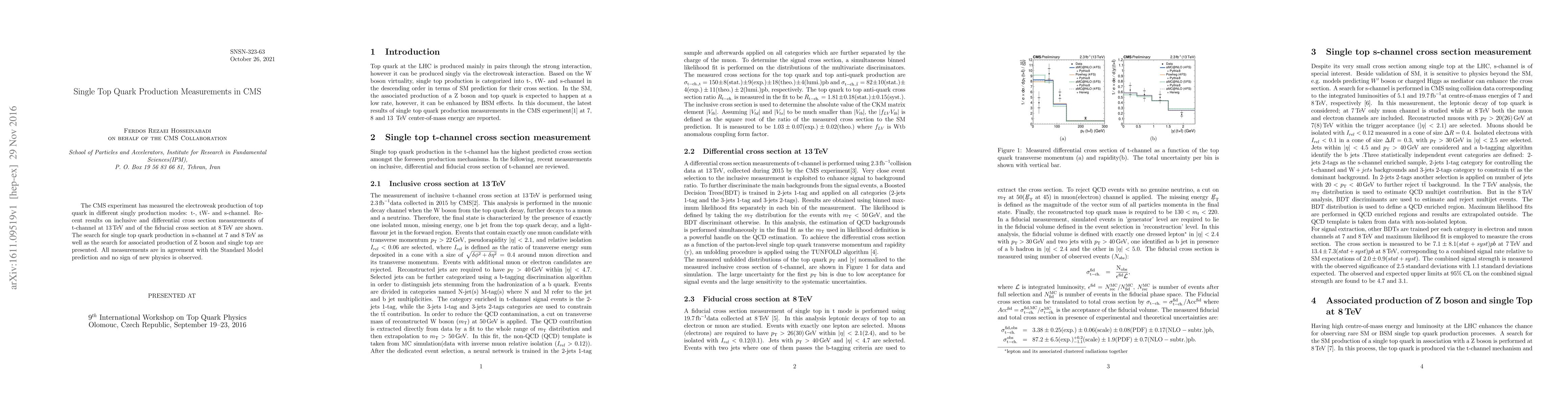 The CMS experiment reports measurements of single top quark production in various channels (t-, tW-, and s-channel) at different energies, confirming Standard Model predictions with no evidence of new physics. All results align with theoretical expectations.
