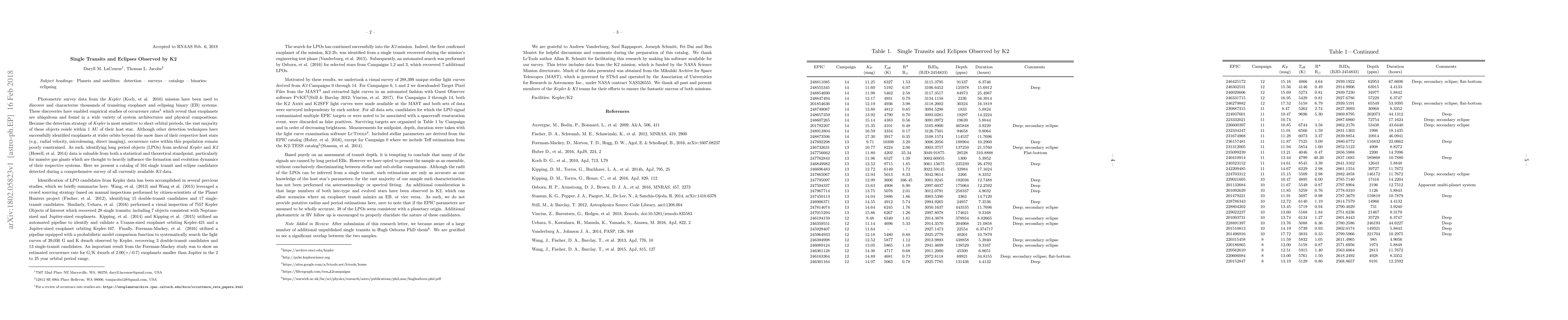 This paper catalogs 164 single transit and eclipse candidates from K2 mission data, focusing on long-period objects that are less frequently detected. These findings enhance the understanding of exoplanet occurrence rates and the dynamics of planetary systems.