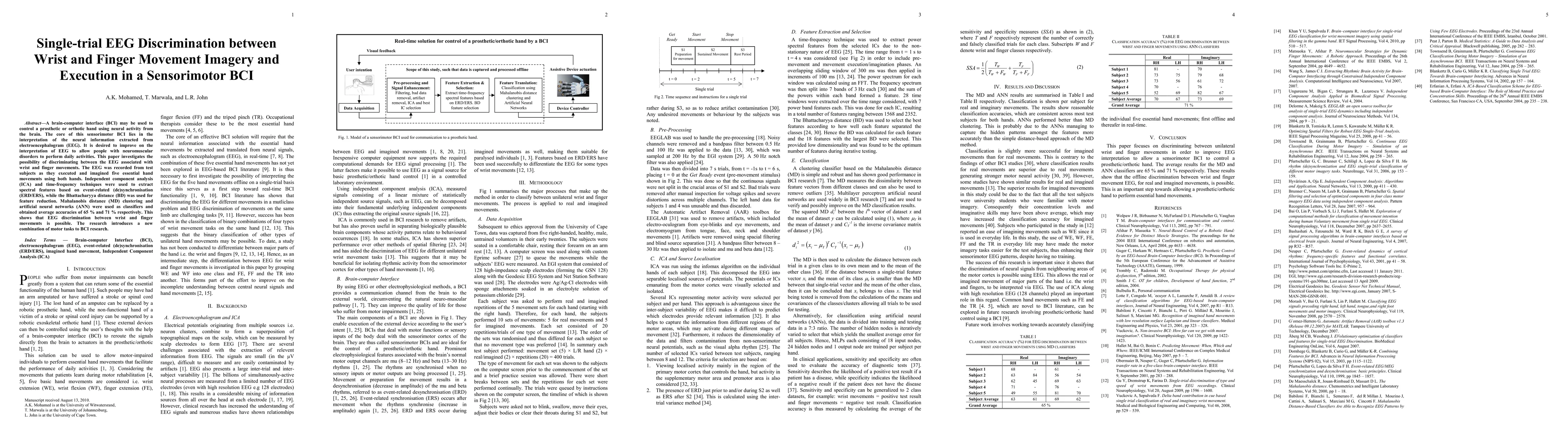 A brain-computer interface (BCI) may be used to control a prosthetic or orthotic hand using neural activity from the brain. The core of this sensorimotor BCI lies in the interpretation of the neural information extracted from electroencephalogram (EEG). It is desired to improve on the interpretation of EEG to allow people with neuromuscular disorders to perform daily activities. This paper investigates the possibility of discriminating between the EEG associated with wrist and finger movements. The EEG was recorded from test subjects as they executed and imagined five essential hand movements using both hands. Independent component analysis (ICA) and time-frequency techniques were used to extract spectral features based on event-related (de)synchronisation (ERD/ERS), while the Bhattacharyya distance (BD) was used for feature reduction. Mahalanobis distance (MD) clustering and artificial neural networks (ANN) were used as classifiers and obtained average accuracies of 65 % and 71 % respectively. This shows that EEG discrimination between wrist and finger movements is possible. The research introduces a new combination of motor tasks to BCI research.