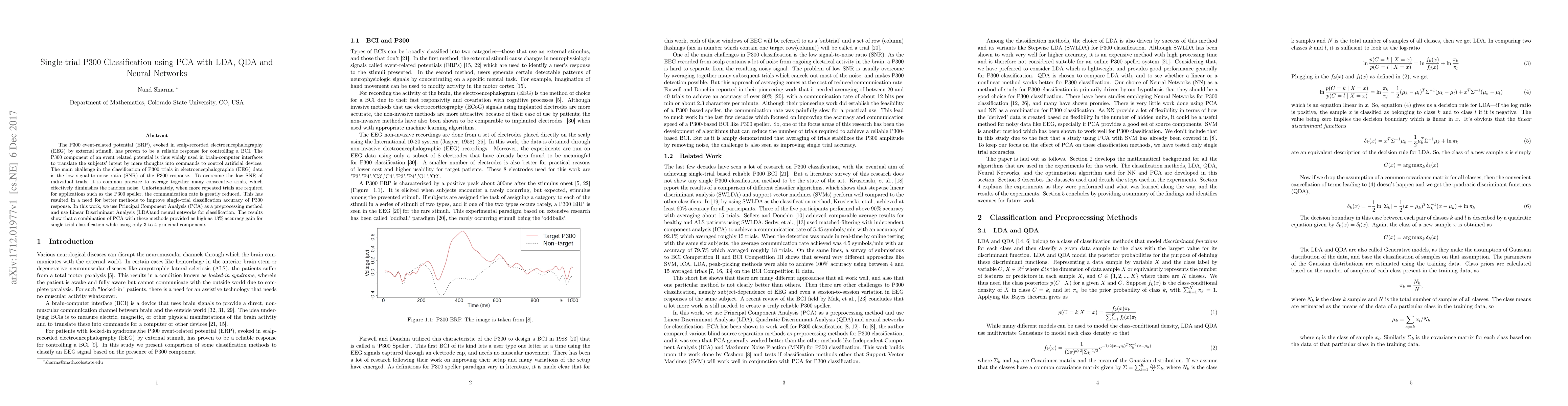 This paper explores methods to improve single-trial P300 event-related potential classification in EEG data, using PCA for preprocessing and LDA, QDA, and neural networks for classification. The results indicate a 13% accuracy gain with minimal principal components.