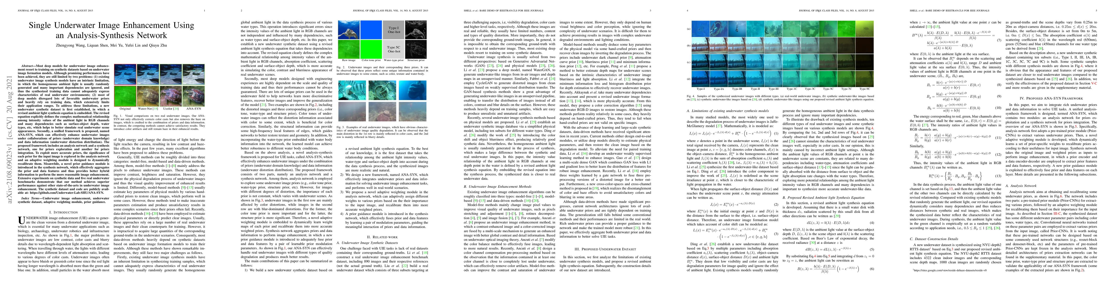 This paper proposes a new underwater image enhancement framework, ANA-SYN, which addresses limitations of existing models by creating a synthetic dataset with improved ambient light modeling and incorporating both underwater domain knowledge and distortion distribution. The framework uses an analysis network to explore and weigh priors and a synthesis network to integrate these priors for more accurate image enhancement.