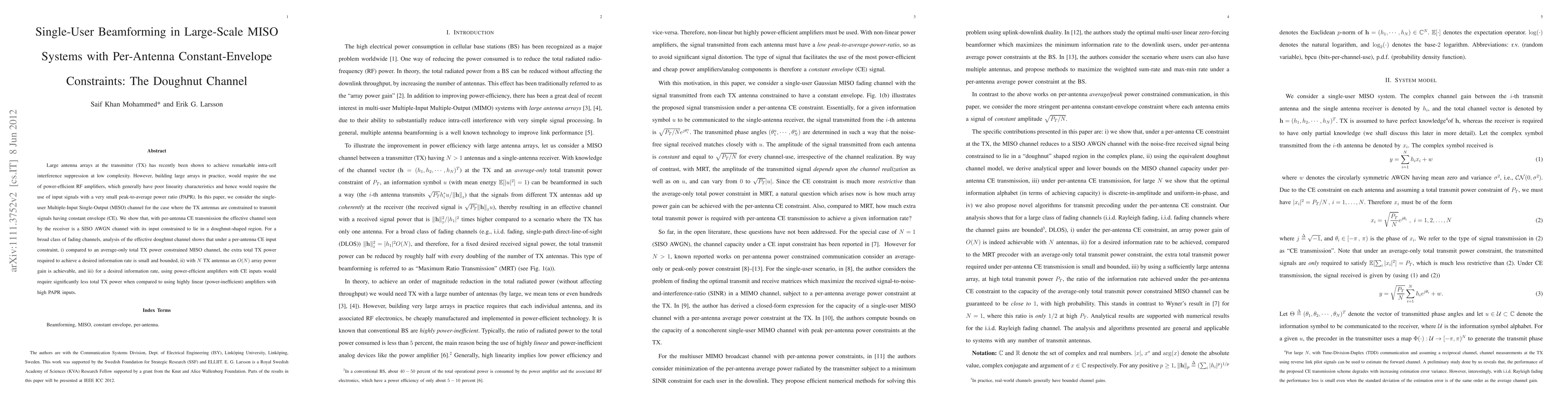 This paper explores single-user beamforming in large-scale MISO systems under per-antenna constant-envelope constraints, revealing that the effective channel resembles a SISO AWGN channel within a doughnut-shaped input region. It demonstrates that with these constraints, the required extra transmit power is minimal, achieving O(N) array power gain with N antennas, and significantly reduces total transmit power compared to highly linear amplifiers.