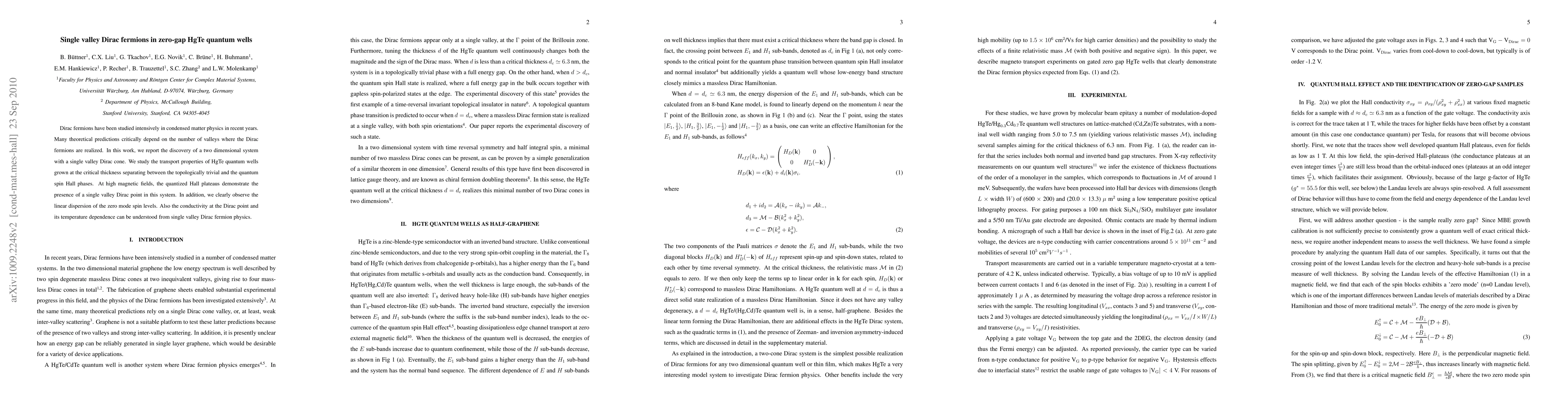 This paper reports the discovery of a two-dimensional system with single valley Dirac fermions in zero-gap HgTe quantum wells, demonstrating quantized Hall plateaus and linear dispersion of spin levels at high magnetic fields, indicating a single valley Dirac point and confirming its transport properties.