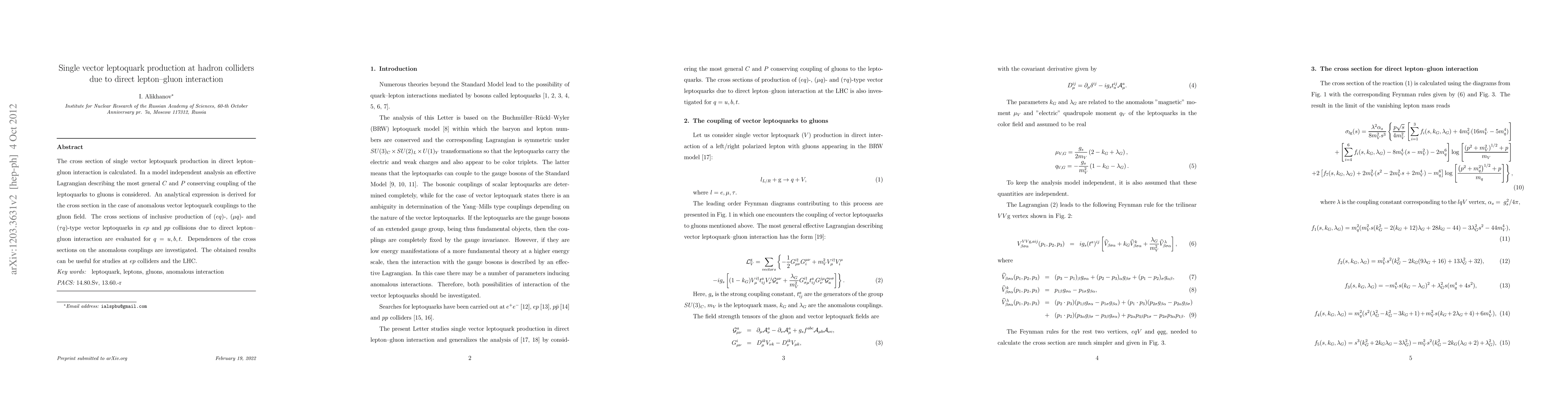 This paper calculates the cross section for single vector leptoquark production via direct lepton-gluon interaction, employing an effective Lagrangian for general $C$ and $P$ conserving couplings. The study evaluates the production of different vector leptoquarks in $ep$ and $pp$ collisions and examines their dependence on anomalous couplings, providing results useful for future collider experiments.