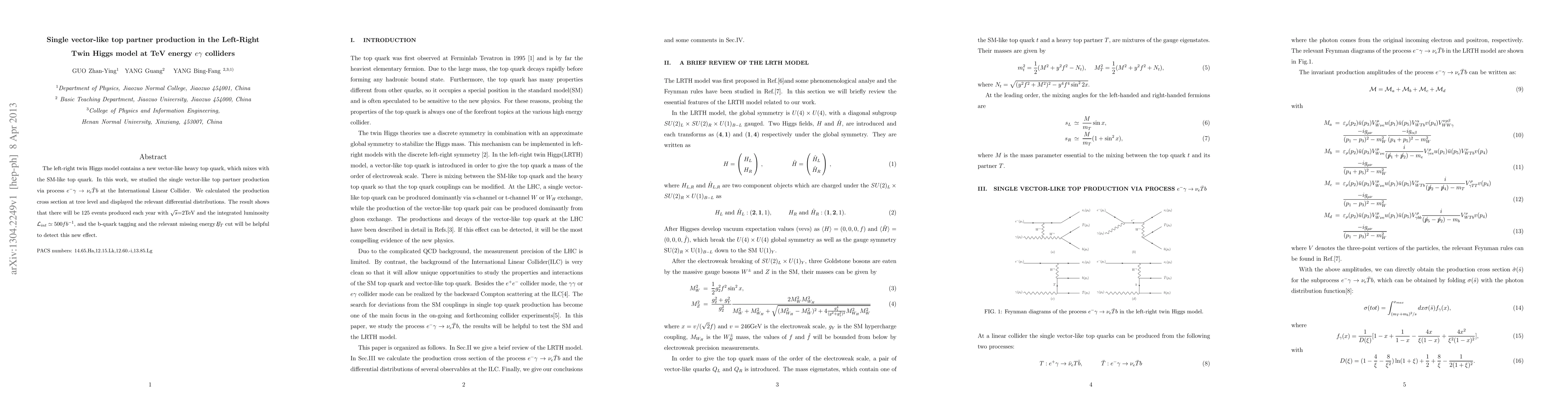 The left-right twin Higgs model contains a new vector-like heavy top quark, which mixes with the SM-like top quark. In this work, we studied the single vector-like top partner production via process $e^{-}\gamma \rightarrow \nu_{e}\bar{T}b$ at the International Linear Collider. We calculated the production cross section at tree level and displayed the relevant differential distributions. The result shows that there will be 125 events produced each year with $\sqrt{s}$=2TeV and the integrated luminosity $\mathcal L_{int}\simeq 500fb^{-1}$, and the b-quark tagging and the relevant missing energy $\met$ cut will be helpful to detect this new effect.
