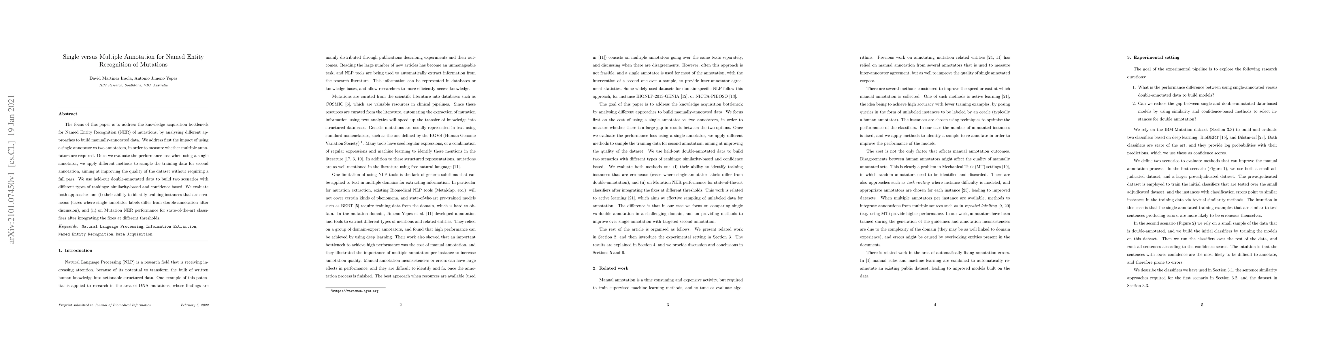 The focus of this paper is to address the knowledge acquisition bottleneck for Named Entity Recognition (NER) of mutations, by analysing different approaches to build manually-annotated data. We address first the impact of using a single annotator vs two annotators, in order to measure whether multiple annotators are required. Once we evaluate the performance loss when using a single annotator, we apply different methods to sample the training data for second annotation, aiming at improving the quality of the dataset without requiring a full pass. We use held-out double-annotated data to build two scenarios with different types of rankings: similarity-based and confidence based. We evaluate both approaches on: (i) their ability to identify training instances that are erroneous (cases where single-annotator labels differ from double-annotation after discussion), and (ii) on Mutation NER performance for state-of-the-art classifiers after integrating the fixes at different thresholds.