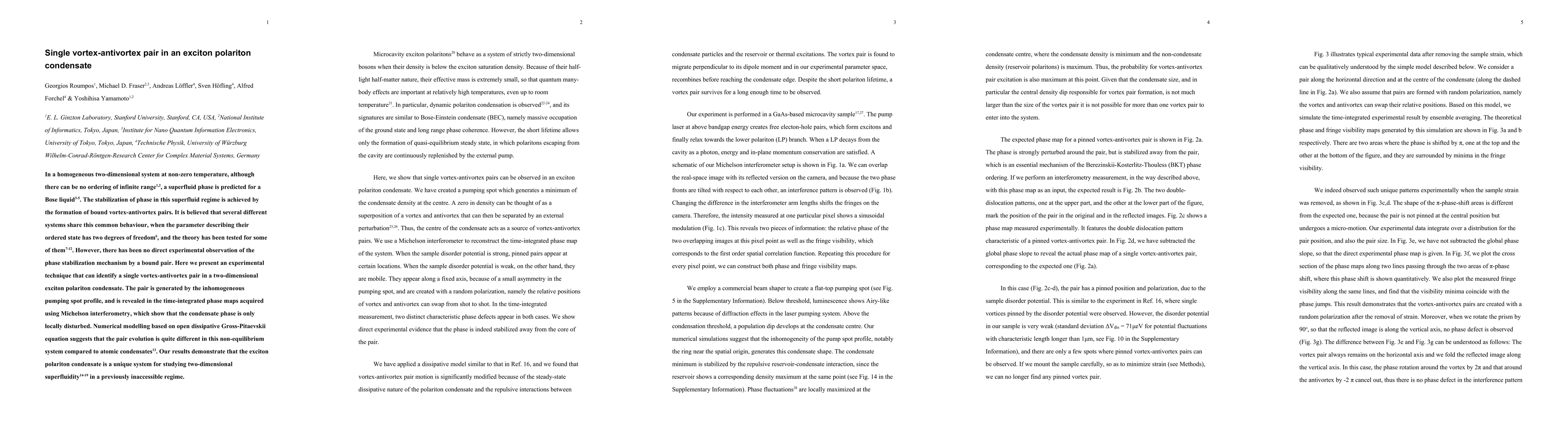 This paper presents an experimental technique to identify a single vortex-antivortex pair in an exciton polariton condensate, revealing local phase disturbances through Michelson interferometry. Numerical modeling indicates distinct evolution in this non-equilibrium system compared to atomic condensates, highlighting the potential of exciton polaritons for studying two-dimensional superfluidity.